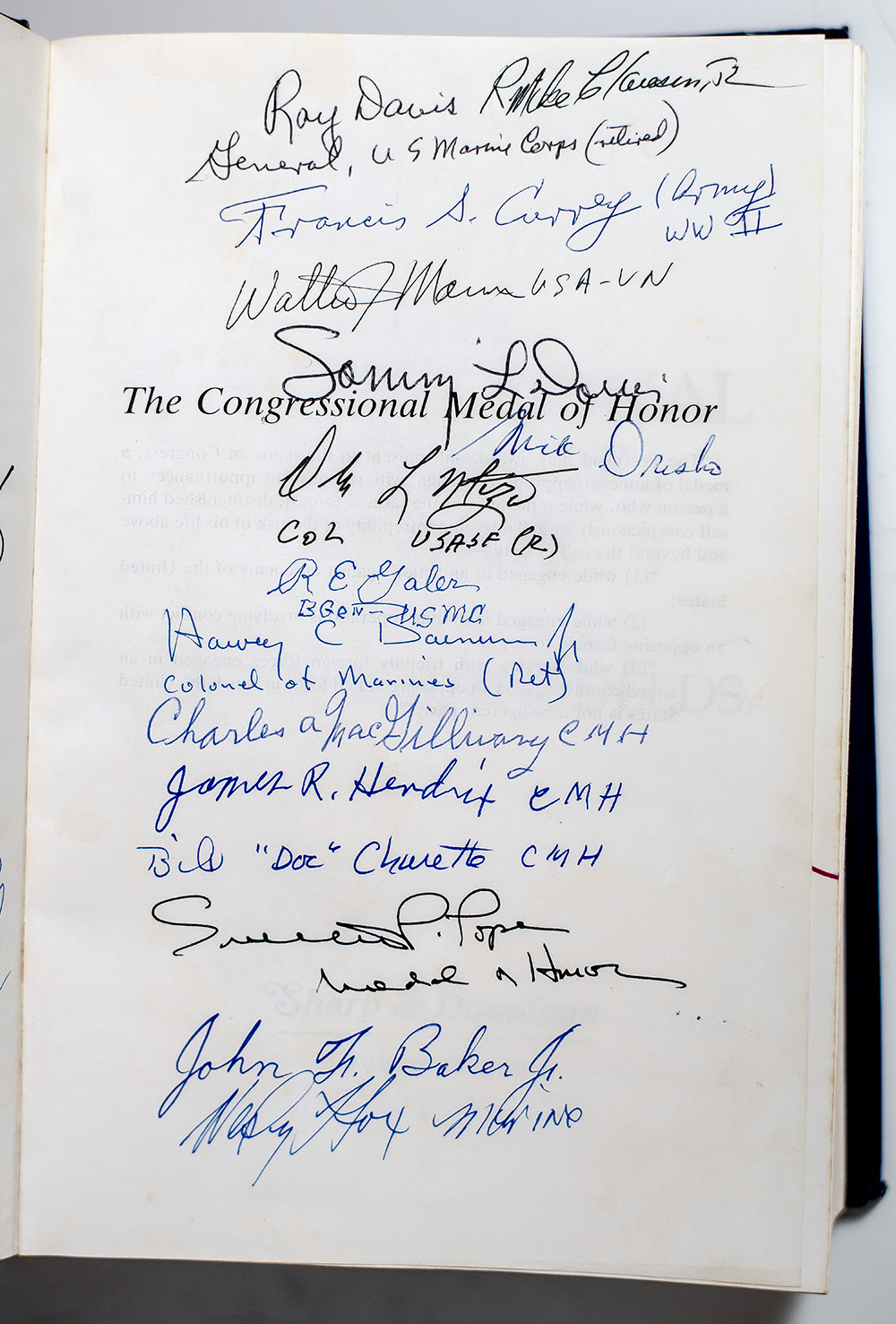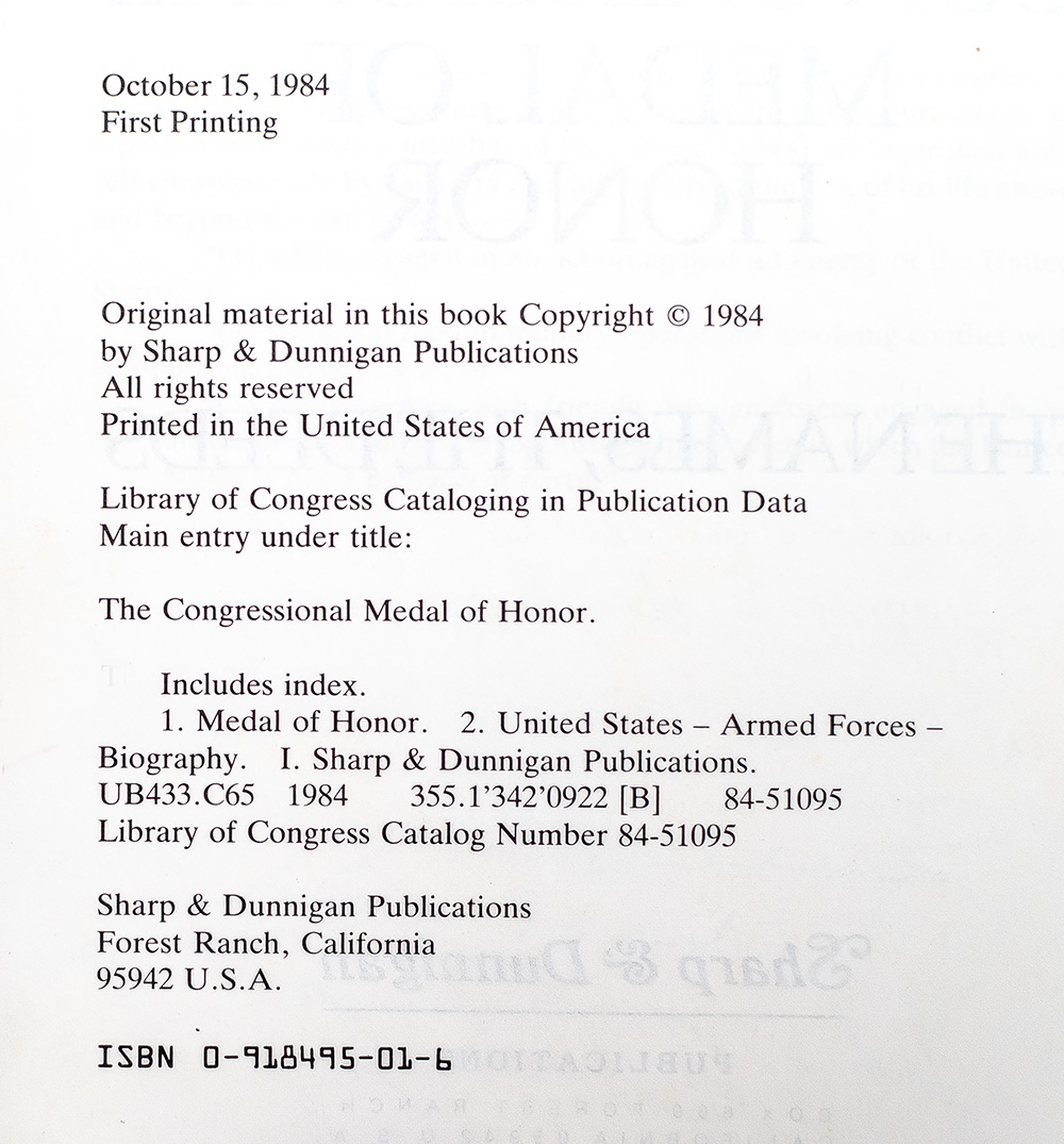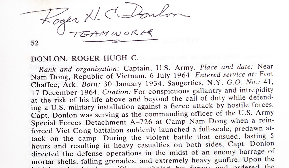 First edition of the complete record of recipients of the Congressional Medal of Honor, from the Civil War through Vietnam. Octavo, original cloth. Presentation copy, signed by 30 recipients of the Medal of Honor on the half-title page and opposite the half-title including Joe Foss, Donald Rudolph, Robert E. Simanek, John F. Baker, Jr., Ray Davis, Francis S. Currey, Charles A. MacGillivary, James R. Hendrix, William Charette, Rodolfo P. Hernández, Joseph C. Rodriguez, Harvey C. Barnum, Jr., and Roger Donlon. Accompanied by 10 additional postcards signed by honorees including Lee Mize, William Westmoreland, Roy Benavidez, and others, as well as a greeting card signed by Rodolfo P. Hernández. Very good in a good dust jacket. A unique collection.