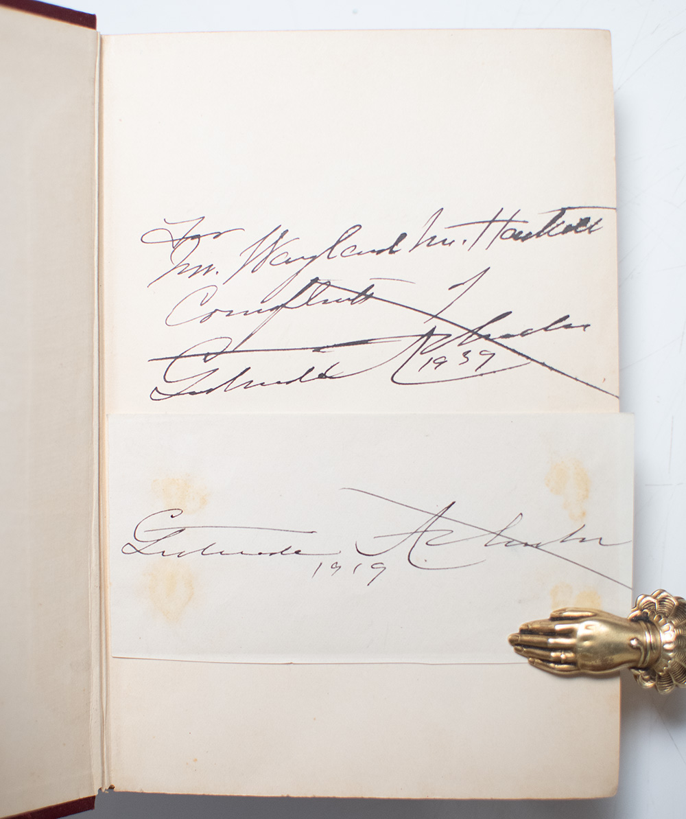 First edition of this historical novel that blends biographical narrative with romanticized fiction to construct a dramatic portrait of one of America’s founding figures. Octavo, original publisher's cloth with gilt titles and detailing to the spine and front panel, top edge gilt. Presentation copy, inscribed by the author on the half-title page, "To Mr. Wayland M. Houter compliments of Gertrude Atherton 1939." In near fine condition. Housed in a custom folding chemise and half morocco slipcase. Accompanied by an additional autograph of Atherton laid in and dated 1919.
