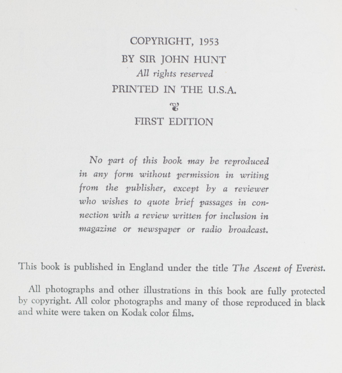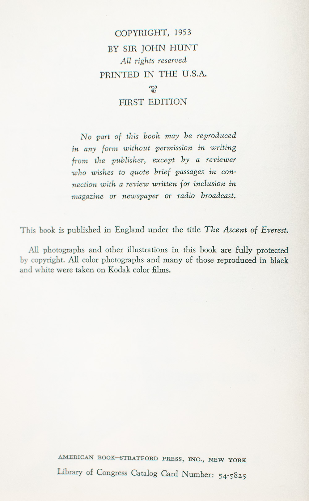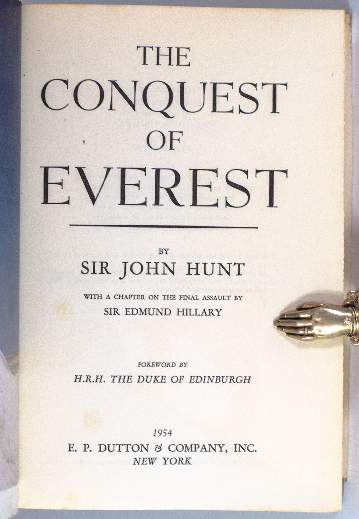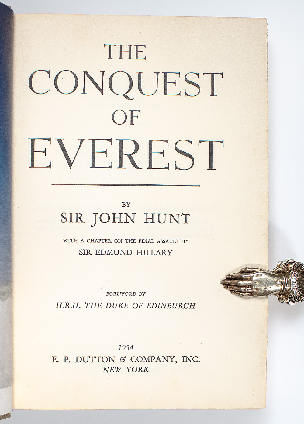 First edition of this classic account of the first ascent of Mount Everest. Octavo, original half cloth, illustrated with 8 pages of  photographs in full color, and 48 pages in black and white, maps, sketches and drawings. Foreword by Prince Philip, The Duke of Edinburgh. Boldly signed by signed by three expedition members on the front endpaper, Edmund Hillary, George Lowe and Charles Evans.  Additionally inscribed by Evans above the signatures, "To all the Edwards." Near fine in a very good dust jacket. Rare and desirable signed by these mountaineering legends.