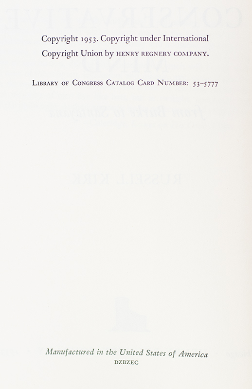 "The true natural rights of men, then, are equal justice, security of labor and property, the amenities of civilized institutions, and the benefits of orderly society": First edition of Russell Kirk's The Conservative Mind