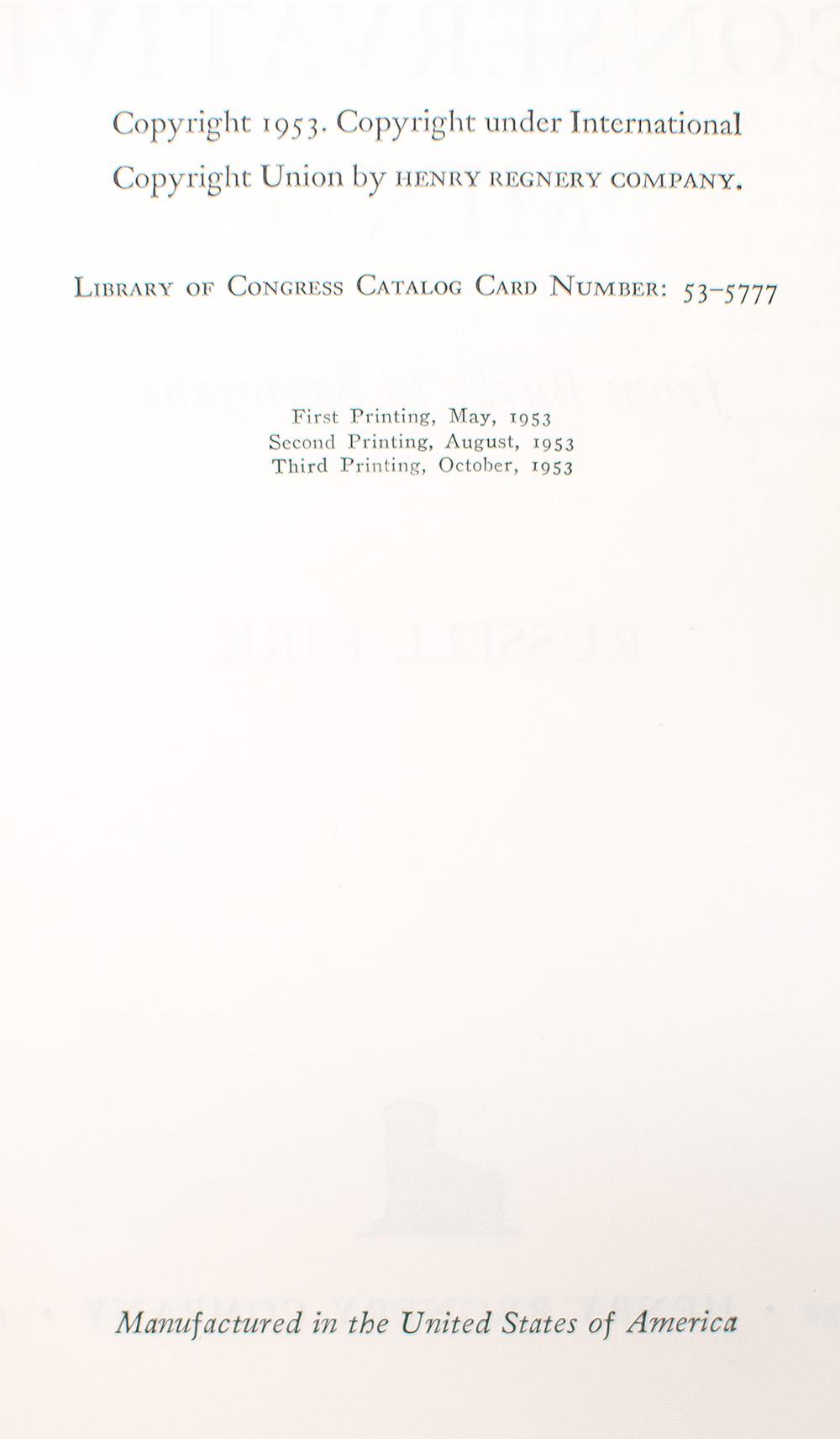 "The true natural rights of men, then, are equal justice, security of labor and property, the amenities of civilized institutions, and the benefits of orderly society": First edition of Russell Kirk's The Conservative Mind