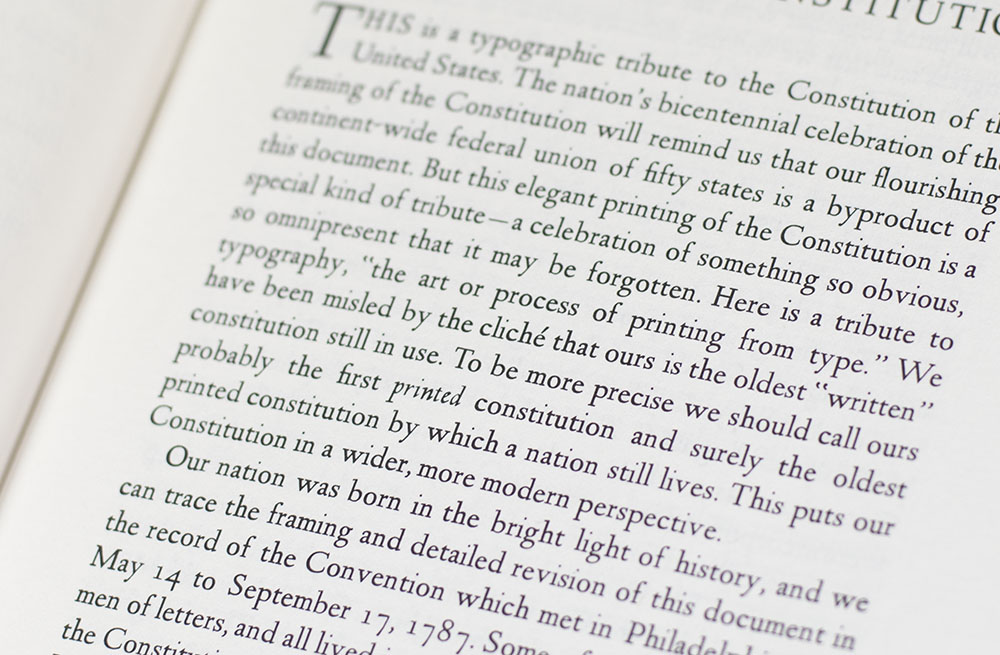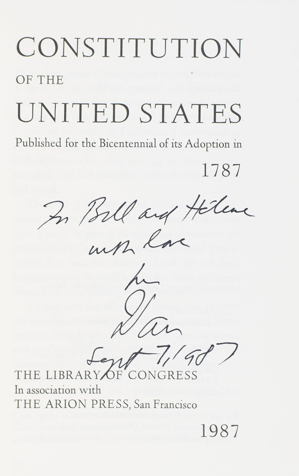 First edition of the Constitution published for the bicentennial of its adoption in 1787. Octavo, original wrappers. Association copy, inscribed by Daniel Boorstin on the title page, "For Bill and Helene with love from Dan Sept 7, 1987." The recipient, William Safire was an important American author, columnist, journalist, and presidential speechwriter and a close friend of the then Librarian of Congress Daniel Boorstin. Safire joined Nixon’s campaign for the 1960 Presidential race, and again in 1968. After Nixon’s 1968 victory, Safire served as a speechwriter for him and Spiro Agnew. He authored several political columns in addition to his weekly column “On Language” in The New York Times Magazine from 1979 until the month of his death and authored two books on grammar and linguistics: The New Language of Politics (1968) and what Zimmer called Safire’s “magnum opus,” Safire’s Political Dictionary. Safire later served as a member of the Pulitzer Prize Board from 1995 to 2004 and in 2006 was awarded the Presidential Medal of Freedom by President George W. Bush. Preface by Warren E. Burger. Introduction by Daniel Boorstin. Also, laid in is a signed letter to Helene Safire from Ruth Boorstin, on their personal letterhead. In near fine condition.