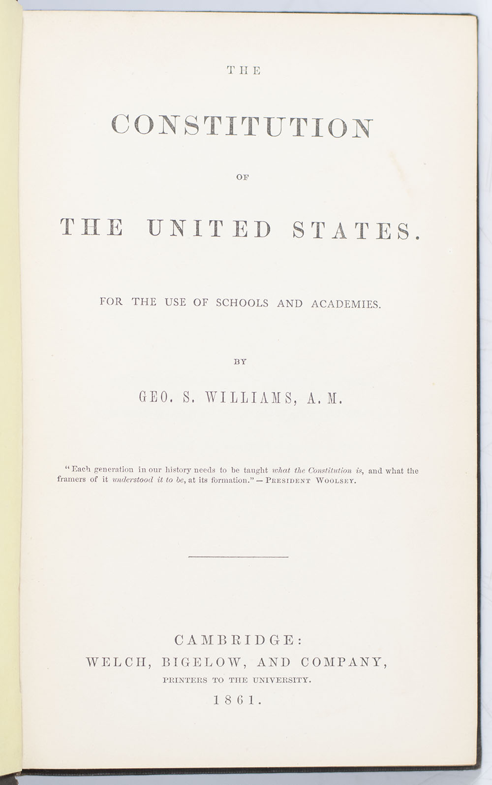 "Each generation in our history needs to be taught what the Constitution is, and what the framers of it understood it to be, at its formation": Rare first edition of George S. Williams' The Constitution of The United States For the Use of Schools and Academies