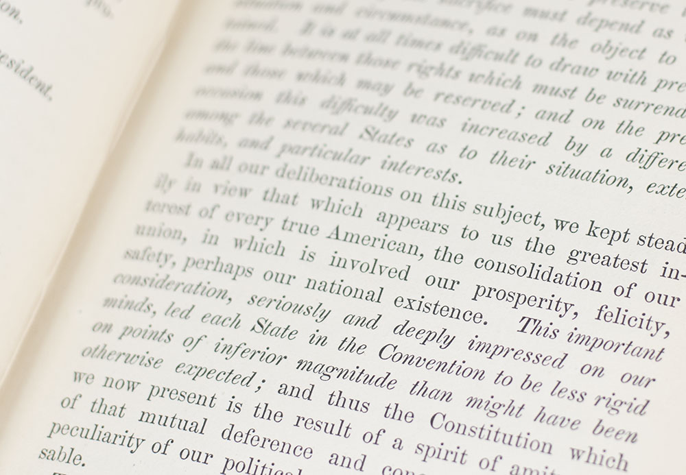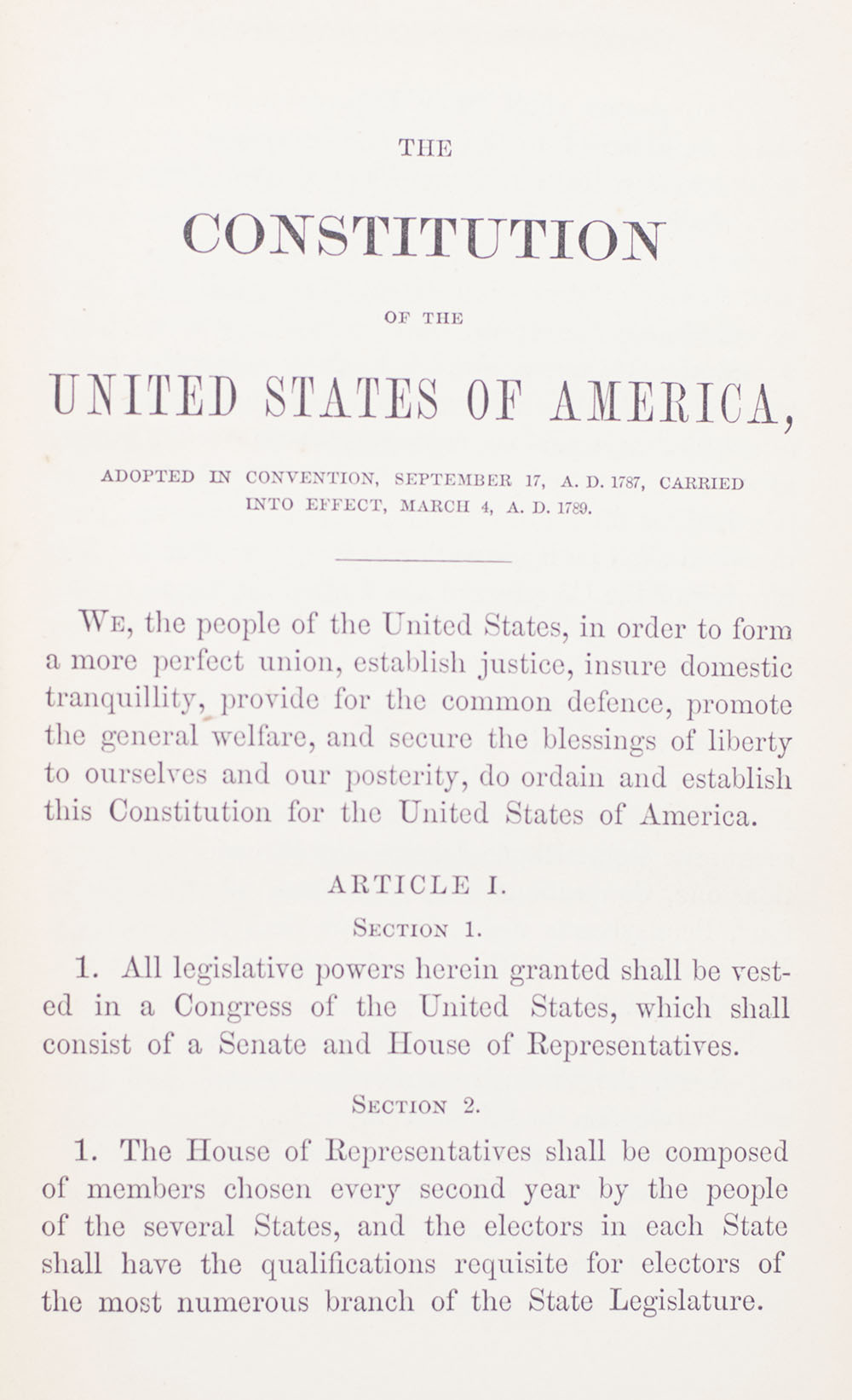 First edition of Williams' Civil War era printing of the United States Constitution, intended for use in both public schools and private academies. Octavo, original cloth elaborately stamped in blind with gilt titles to the spine, gilt American flag and eagle vignette to the front panel. In near fine condition with rubbing to the crown and foot of the spine. Includes The Constitution of the United States, Washington's Farewell Address, The Declaration of Independence, Articles of Confederation.
