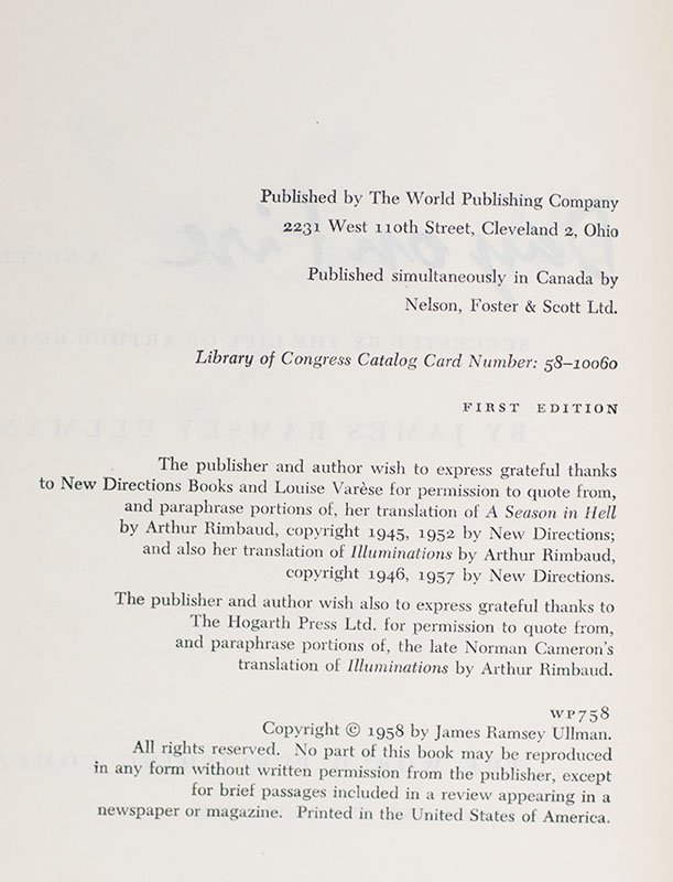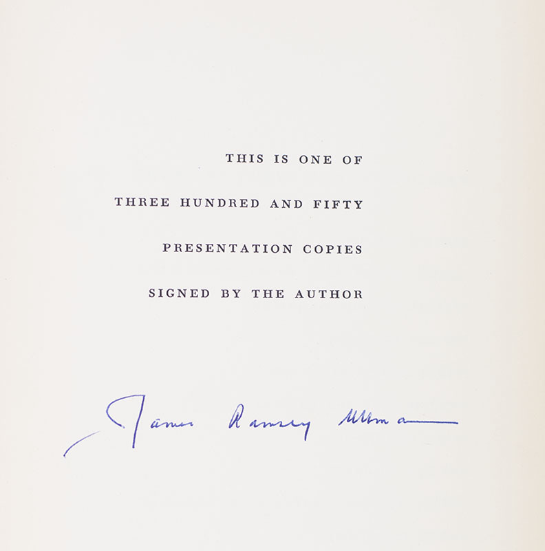 First edition of this masterwork of biographical fiction. Octavo, original cloth. One of 350 presentation copies signed by James Ramsey Ullman. Near fine in a very good dust jacket with a chip to the spine. Jacket design by George Salter.