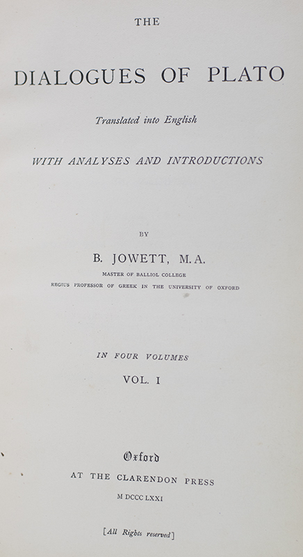 Rare first edition set of Benjamin Jowett's The Dialogues of Plato; attractively bound