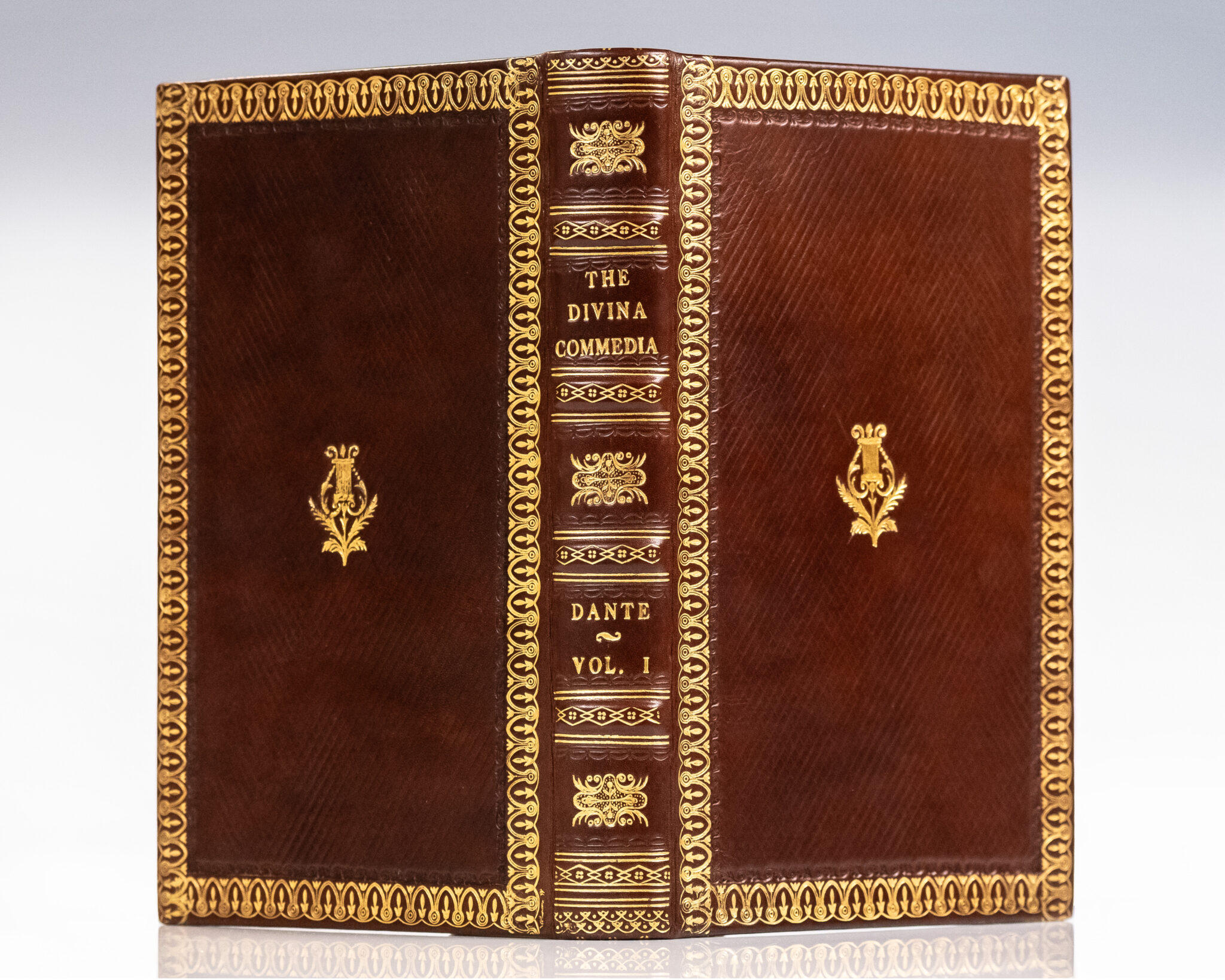 First edition of the first full translation of Dante's Divine Comedy into English, translated with preliminary essays, notes, and illustrations by the Rev. Henry Boyd. Octavo, three volumes, bound in full diced calf with gilt titles and stamping to the spine in six compartments within raised gilt bands, gilt scrolling and central motif to the front and rear panels, gilt turn-ins and inner dentelles, marbled endpapers, engraved frontispiece portrait of Dante by R.H. Cromek. In very good condition with some light toning throughout. A very attractive example.