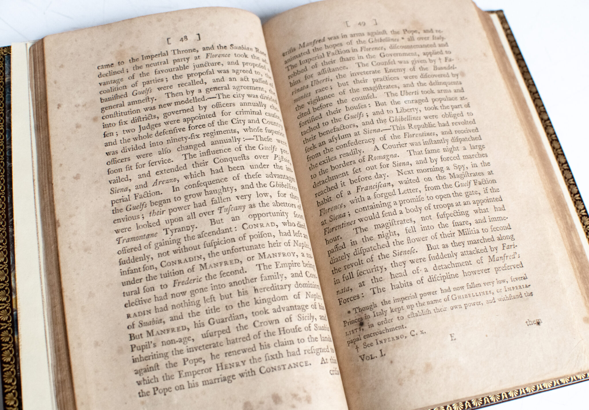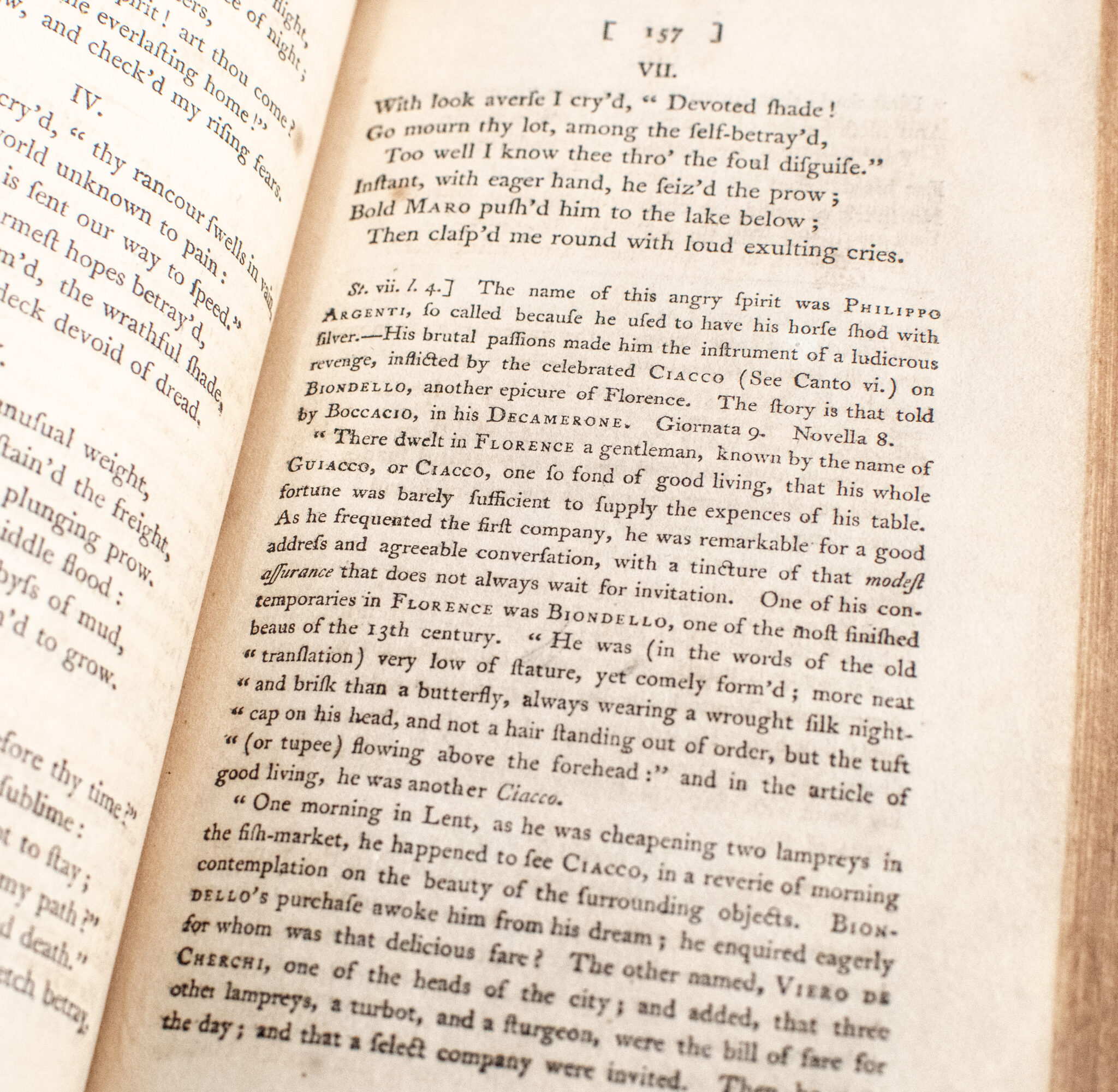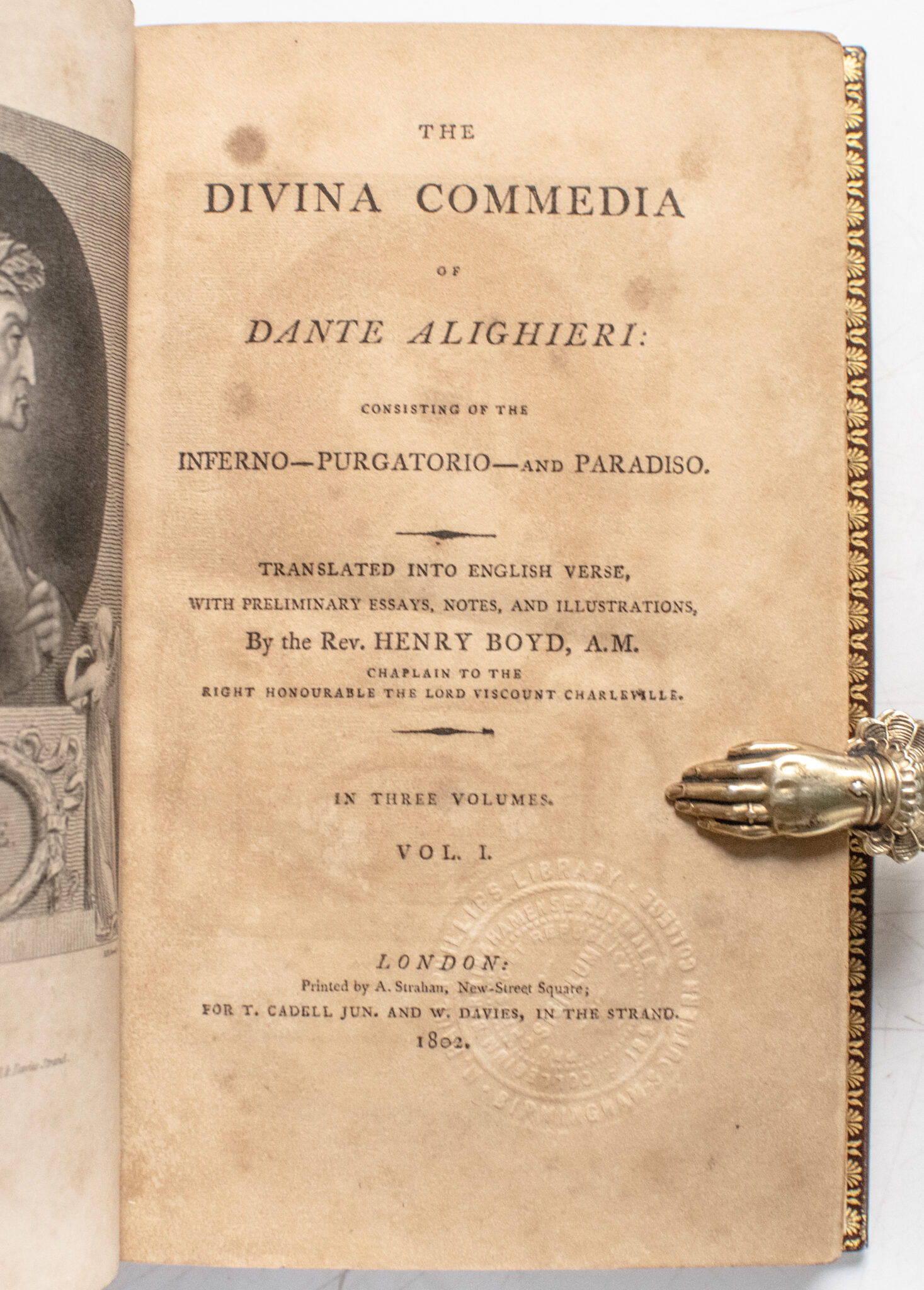 “Dante’s theme, the greatest yet attempted in poetry, was to explain and justify the Christian cosmos through the allegory of a pilgrimage. To him comes Virgil, the symbol of philosophy, to guide him through the two lower realms of the next world, which are divided according to the classifications of the ‘Ethics’ of Aristotle. Hell is seen as an inverted cone with its point where lies Lucifer fixed in ice at the centre of the world, and the pilgrimage from it a climb to the foot of and then up the Purgatorial Mountain. Along the way Dante passes Popes, Kings and Emperors, poets, warriors and citizens of Florence, expiating the sins of their life on earth. On the summit is the Earthly Paradise where Beatrice meets them and Virgil departs. Dante is now led through the various spheres of heaven, and the poem ends with a vision of the Deity. The audacity of his theme, the success of its treatment, the beauty and majesty of his verse, have ensured that his poem never lost its reputation. The picture of divine justice is entirely unclouded by Dante’s own political prejudices, and his language never falls short of what he describes" (PMM). Henry Boyd was an Irish-born translator, likely educated at Dublin University, who is best known for his early English verse renderings of major Italian classics. In 1802 he published a three-volume translation of Dante’s Divina Commedia, accompanied by preliminary essays, notes, and illustrative apparatus, and dedicated the work to Viscount Charleville, identified on the title page as Boyd’s patron and ecclesiastical superior. In his dedication, Boyd remarks that the violence and uncertainty of the Irish Rebellion compelled him to withdraw from Charleville’s side and seek refuge in a “remote angle of the province,” where he continued his literary labors. He later undertook work on Ariosto’s Orlando Furioso and in 1807 issued his translation of Petrarch’s Triumphs, further consolidating his reputation as a mediator of Italian literature for an English-speaking readership.