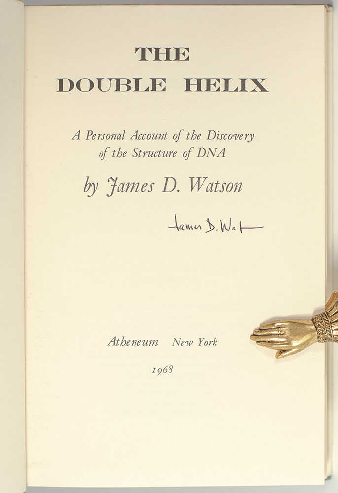 First edition, fourth printing, published two months after the first of Watson's ground breaking work regarding the discovery of DNA for which the author, Francis Crick and Maurice Wilkins were awarded the Nobel Prize in Medicine in 1962. Octavo, original blue cloth, with numerous diagrams and photographic illustrations. Signed by James D. Watson on the title page. Near fine in a near fine dust jacket, name to the front free endpaper. Jacket design by Jeanyee Wong. Foreword by Sir Lawrence Bragg.