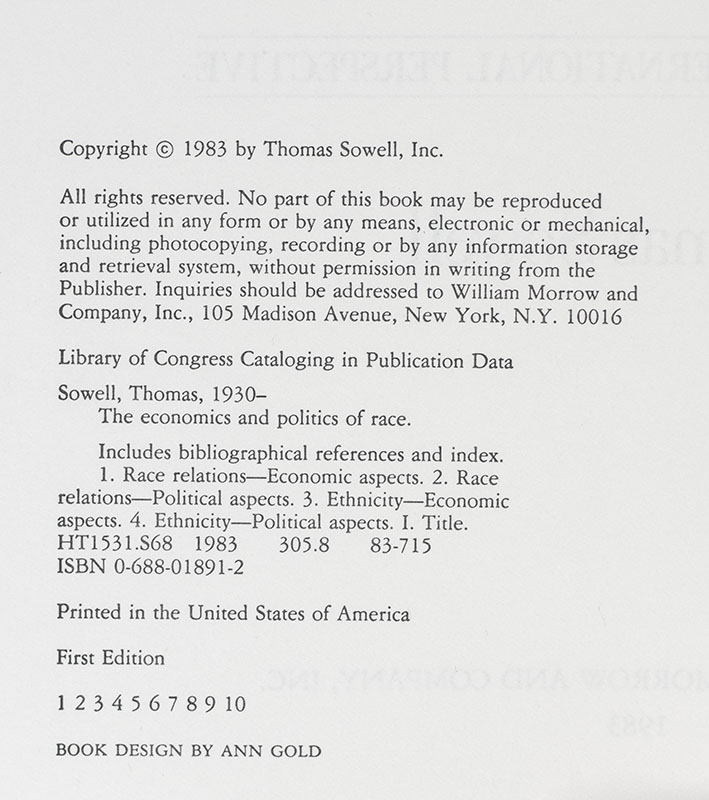 First edition of this classic work. Octavo, original half cloth. Presentation copy, inscribed by the author on the front free endpaper, "To Joe Perkins with best wishes from Tom Sowell." Near fine in a very good dust jacket. Jacket design by David Gatti.