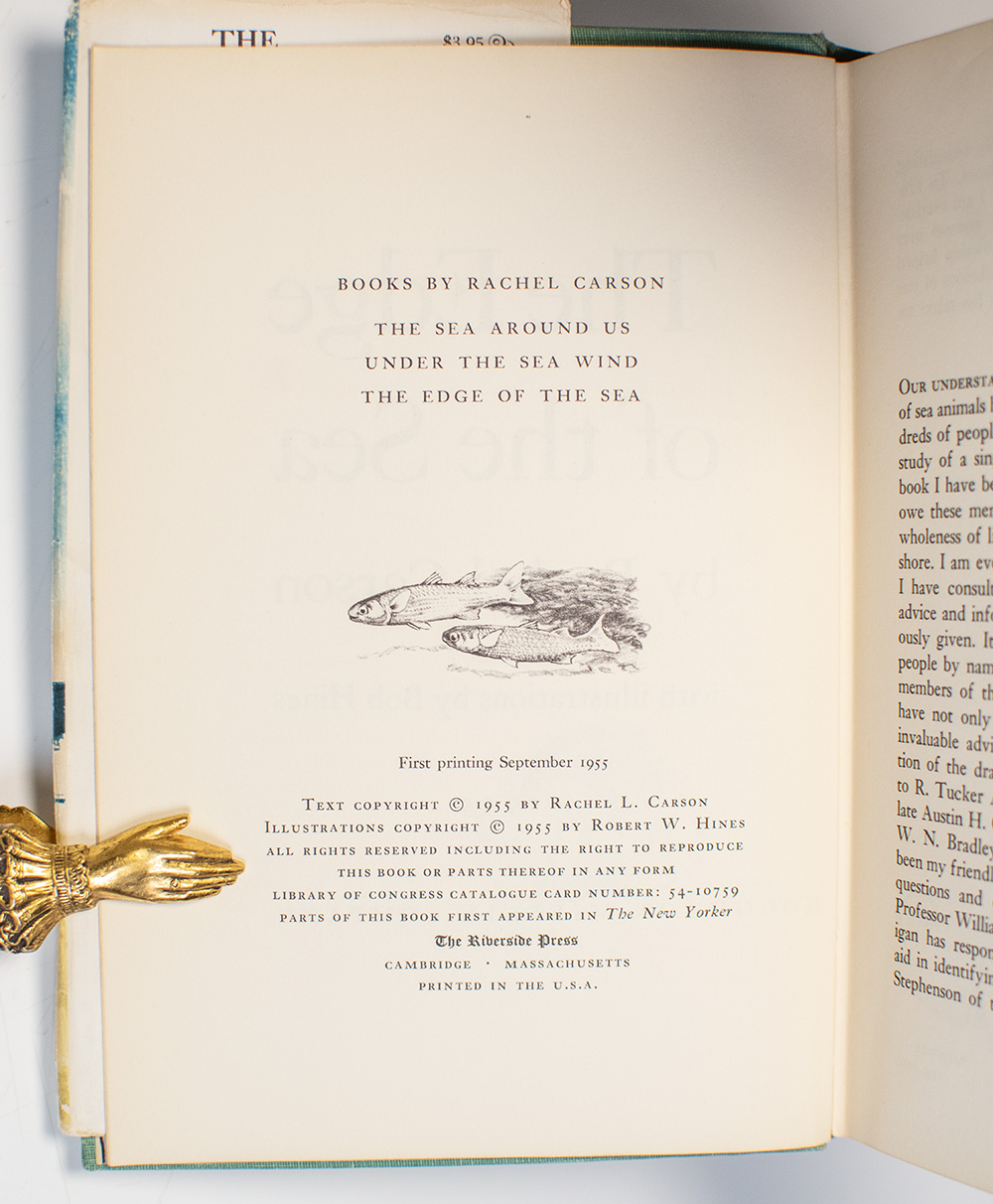 First edition of Carson's classic work, which explores marine life that takes us into “a truly extraordinary world” (The Atlantic Monthly). Octavo, original cloth, illustrated. Presentation copy, inscribed by the author on the half-title page, "Inscribed for Miss Mary Lindsay with best wishes of Rachel Carson." Illustrated by Bob Hines. Near fine in a very good dust jacket. Uncommon signed and inscribed.