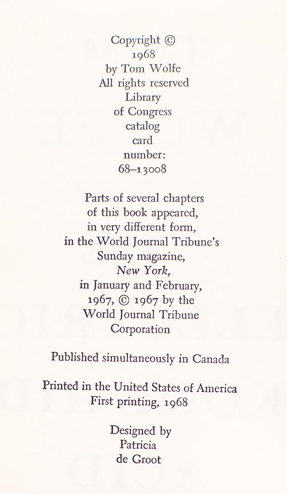 "Everybody is going to be what they are, and whatever they are": First Edition of The Electric Kool-Aid Acid Test; Finely Bound by the Harcourt Bindery and Signed by Tom Wolfe and Ken Kesey