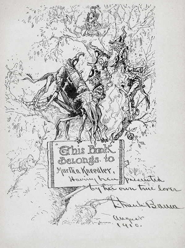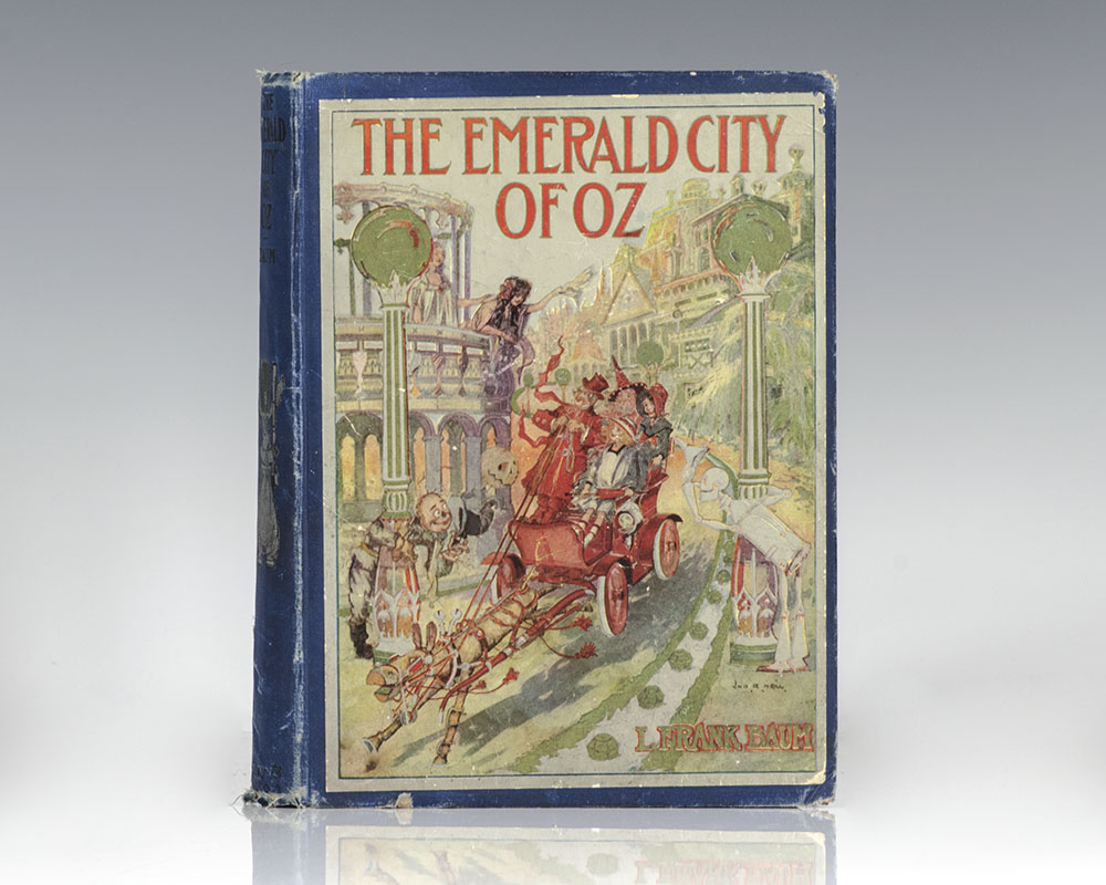 First edition, first state of the sixth Oz book, with the colored pictorial front panel and 16 elaborate full-page color illustrations by John R. Neill. Octavo, original blue cloth, illustrated with 16 color plates with metallic green ink and numerous black & white drawings by John R. Neill. Presentation copy, inscribed by the author on the the ownership leaf, "Martha Kneedler, Having been presented by her own true lover L. Frank Baum August 1910." The recipient, Martha Kneedler, was the daughter of Baum's close personal friend Major William L. Kneedler, a military medical officer who served as President Taft's personal physician. The inscription was likely in jest as Martha would have been only 16 in 1910. In very good condition with the plates in fine condition. An exquisite example, The Emerald City of Oz was intended to be the final volume in the series, and so Neil embellished his plates with the most elaborate detail of any other volume. Even later printings of the present volume did not include these elaborate designs. Housed in a custom half morocco clamshell box. Scarce and desirable. No other inscribed first printing is known to have appeared at auction.