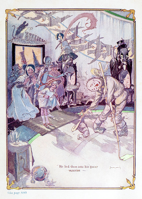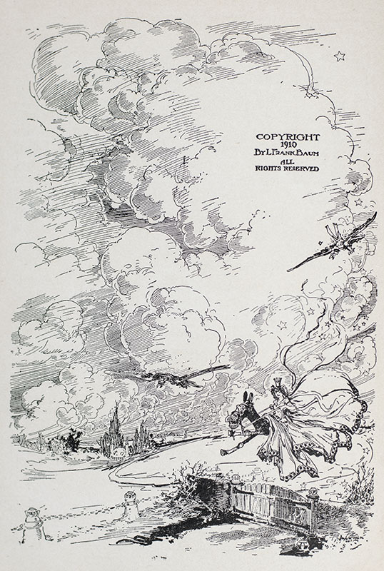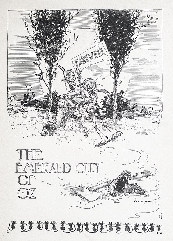 Leaving their financial troubles behind, Dorothy Gale, Uncle Henry and Aunty Em move to Oz. As they tour the magical land on their way to the Emerald City, Dorothy and her family visit never-before seen strange and wonderful parts of Oz, including a city of paper dolls, a city of jigsaw people, and a city of bunnies. Meanwhile, the wicked Nome king plots to conquer Oz and enslave its people, and prepares to invade the Emerald City just as Dorothy and her family arrive. Baum intended to conclude his popular series with this volume. By the tale’s end, the sorceress Glinda has made the fairyland invisible to the outside world, and Dorothy and her aunt and uncle, facing eviction from their Kansas farm, have settled in the Emerald City to stay. Baum’s own bankruptcy the next year, however, would mean he “had no choice but to call once more upon the magic of Oz in an attempt to restore his fortunes” (Eyles, 48).