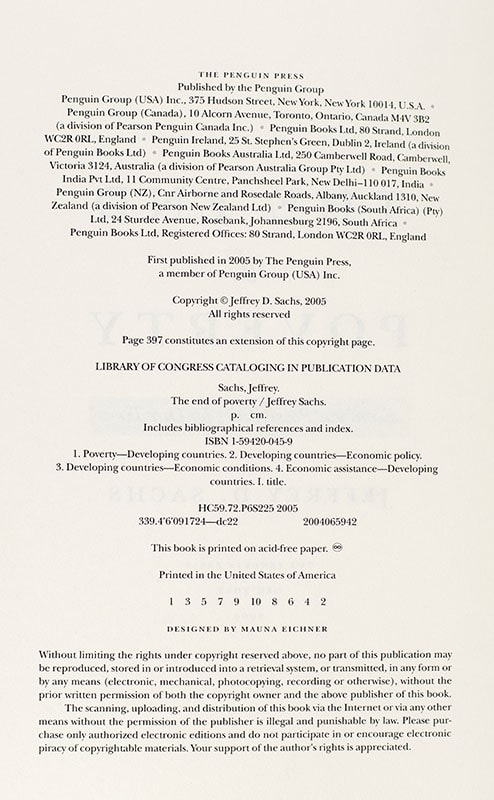 First edition of this landmark exploration of economic prosperity and how the world can escape from extreme poverty for the world's poorest citizens, from one of the world's most renowned economists. Octavo, original boards. Signed by the author on the front free endpaper, "With all best wishes Jeffrey Sachs April 2006." Fine in a fine dust jacket. Jacket design by Peter Mendelsund. Foreword by Bono.