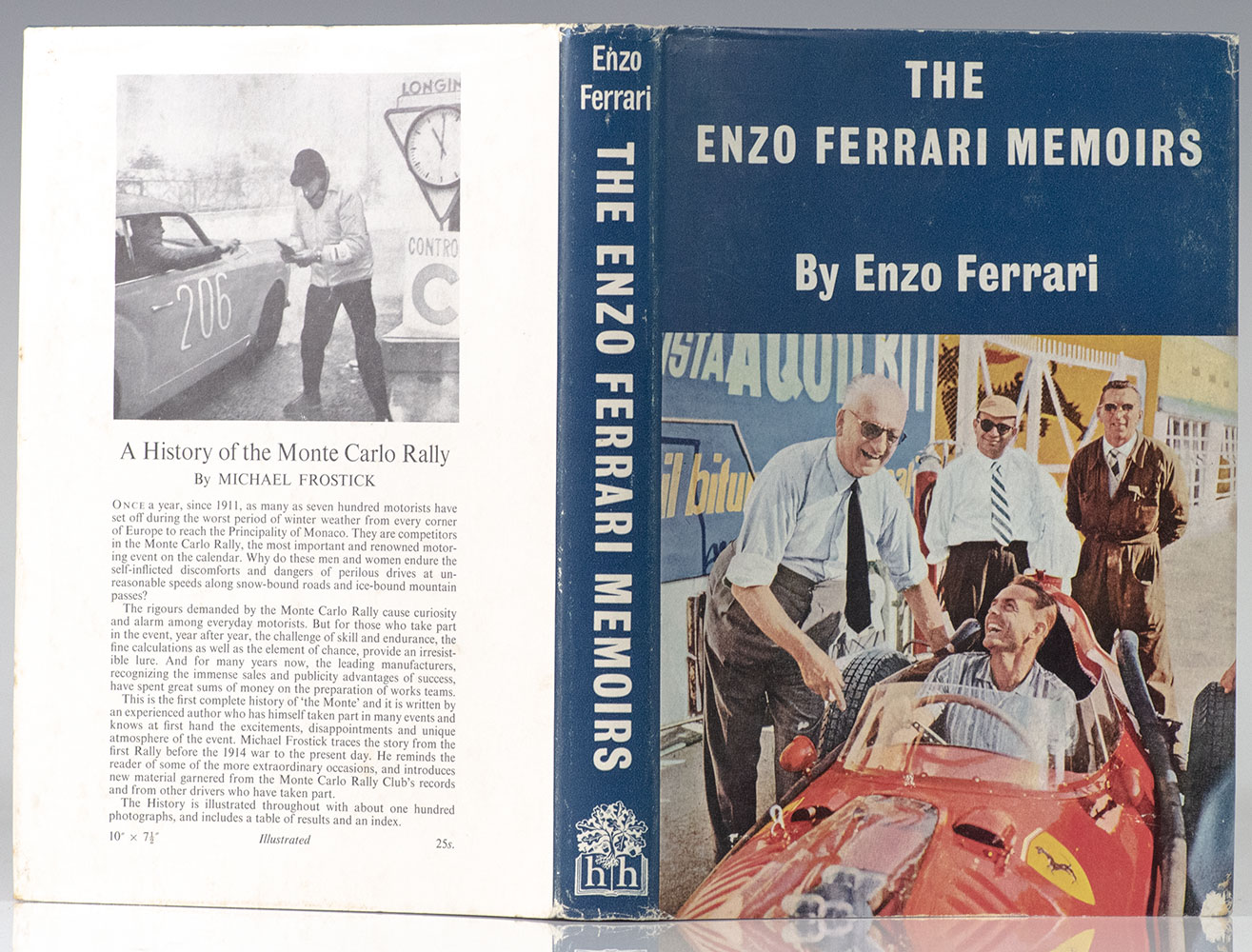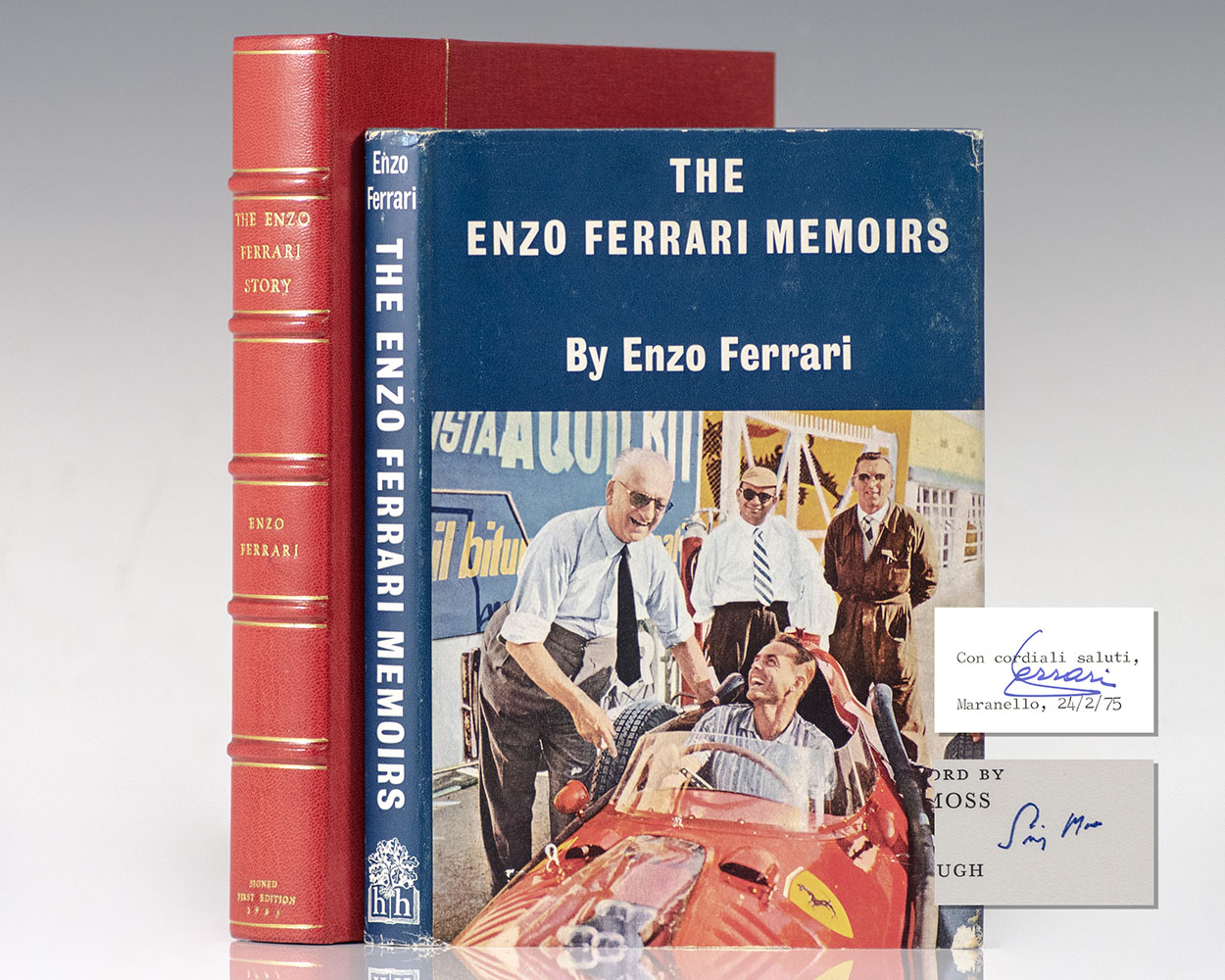 First edition in English of Enzo Ferrari's autobiography. Octavo, original cloth, illustrated. Signed by Enzo Ferrari on a laid in Ferrari card dated 24/2/75 and additionally signed by Stirling Moss on the title page. Foreword by Stirling Moss. Edited by Richard Hough. Translated by Ivan Scott. Near fine in a near fine dust jacket. Housed in a custom half morocco clamshell box. Rare and desirable signed by Ferrari and the legendary driver, Stirling Moss.