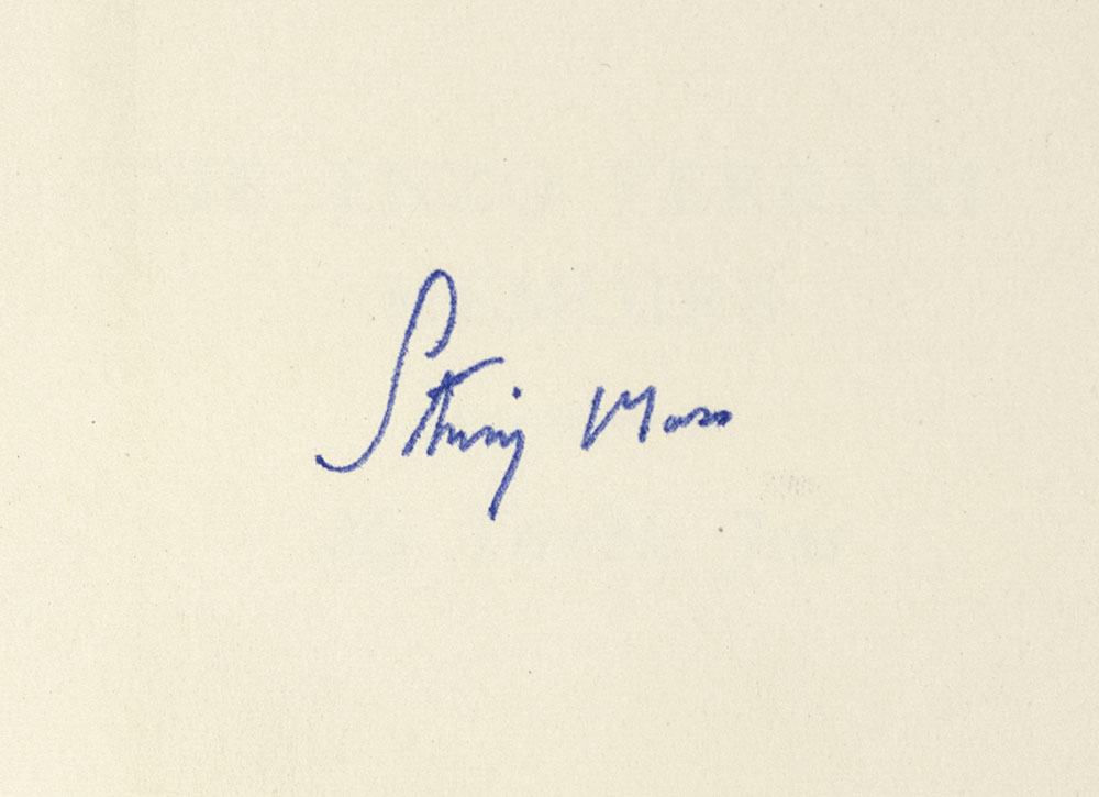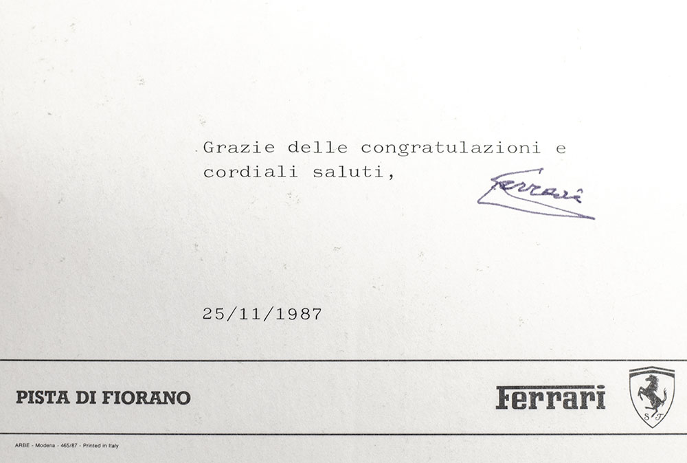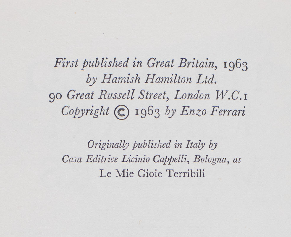 First edition in English of Enzo Ferrari's autobiography. Octavo, original cloth, illustrated. Signed by Enzo Ferrari on a laid in Ferrari card with the original mailing envelope and additionally signed by Stirling Moss on the front free endpaper. Foreword by Stirling Moss. Edited by Richard Hough. Translated by Ivan Scott. Near fine in a near fine dust jacket. Rare and desirable signed by Ferrari and the legendary driver, Stirling Moss.