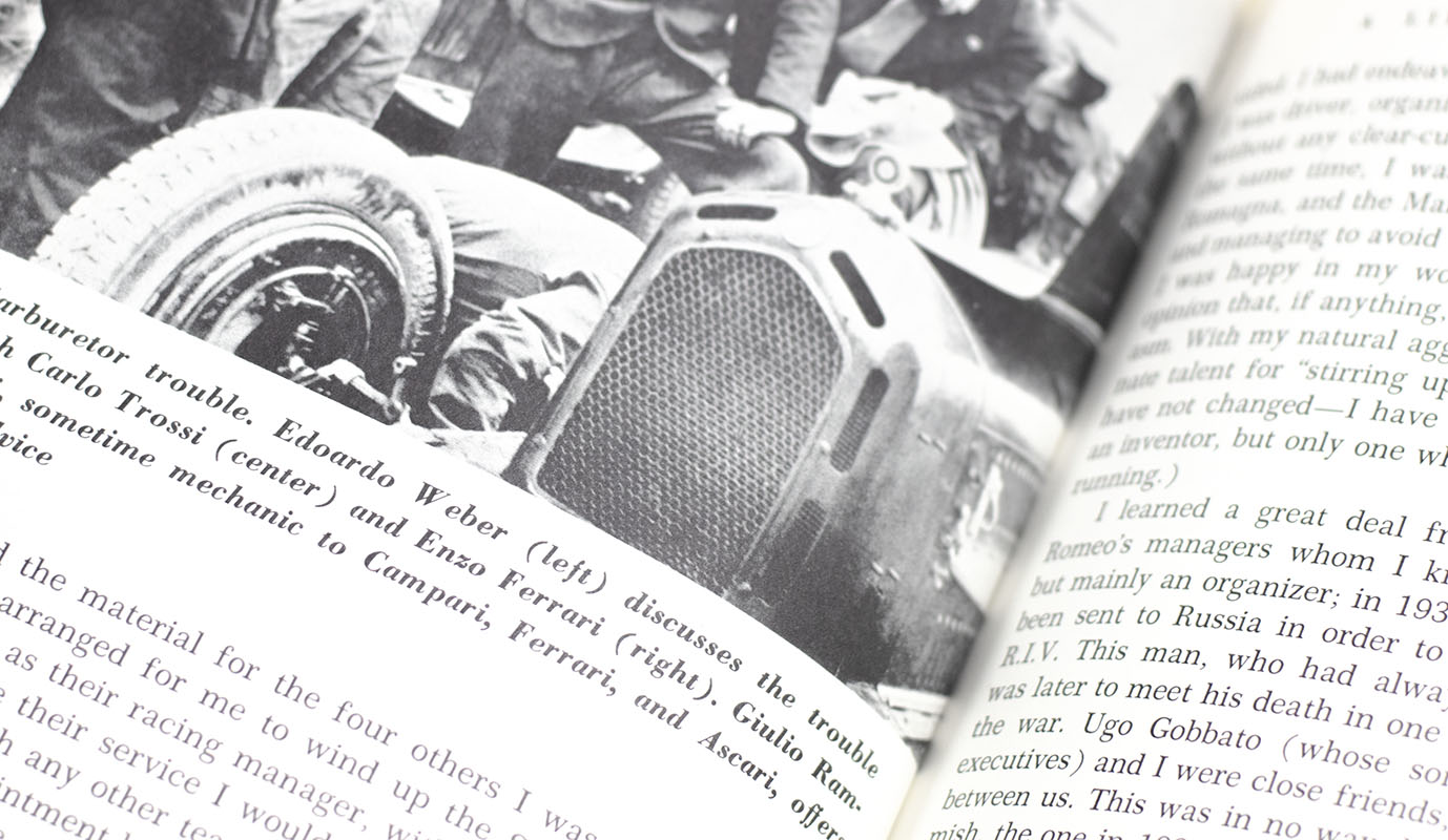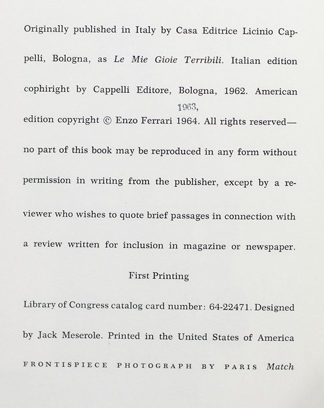 First edition in English of Enzo Ferrari's autobiography. Octavo, original cloth, illustrated. Signed by Stirling Moss on the title page. Foreword by Stirling Moss. Translated by Ivan Scott. Near fine in a good dust jacket with some rubbing and wear. Jacket design by Irving Cowman. Rare and desirable signed by the legendary driver.