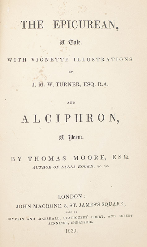 Elaborately bound example of Thomas Moore's only prose novel. Octavo, bound in full teal cracked calf morocco by Riviere & Son with gilt titles and tooling to the spine in six compartments within raised gilt bands, triple gilt ruling and elaborate botanical gilt decorations to the front and rear panels, gilt turn-ins and inner dentelles, all edges gilt with a fore-edge painting of the Nile River at Luxor, illustrated with steel engravings by J. M. W. Turner. In near fine condition. A beautiful and elaborate example from Riviere & Son.