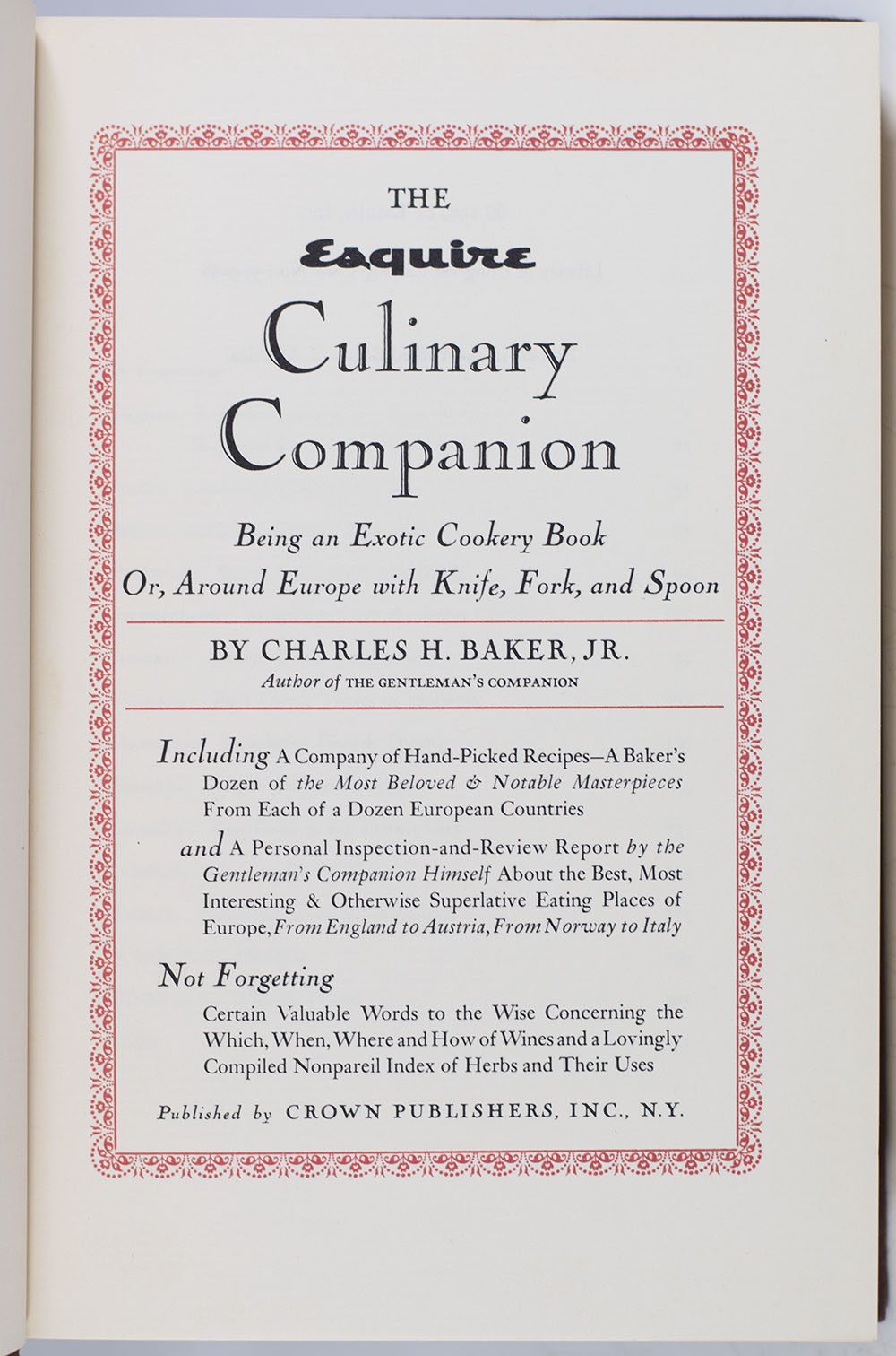 Published on the twentieth anniversary of Baker's masterpiece, Gentleman's Companion, The Esquire Culinary Companion brings together a fine selection of recipes compiled by the author on a whirlwind trip through Europe including 'Interesting Italian Eatables', 'Succulent Spanish Selections', 'Samplings from the Swiss Chefs', and 'Bright Belgian Bouchees'. He states in his foreword: "This volume marks the twenty-fifth anniversary of our Madness, the pleasant madness of collecting recipes. It marks also the twentieth anniversary of the publication of our Gentleman's Companion, a work containing the 700 greatest masterpieces of food and liquid. Since the noble time many roasts have passed through ovens, many chefs have busied themselves in their kitchens, and many artists in food have engaged in devious experiments to find new delights for the connoisseur. And so now - high time - there are enough new masterpiece recipes to reveal (not to mention some old ones that somehow previously escaped the attention of this reporter) to make a book's worth."