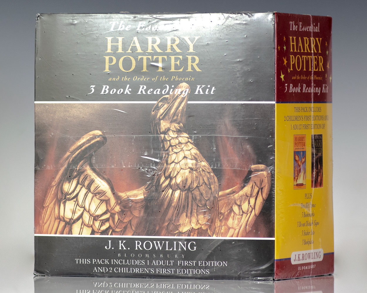 First edition of the Essential Harry Potter and the Order of the Phoenix 3 Book Reading Kit. Octavo, three volumes, housed in the original pictorial slipcase and shrink wrap. The pack includes one adult first edition and 2 children's first editions of Harry Potter and the Order of the Phoenix with 5 bookmarks, 5 Do Not Disturb Signs, 5 sticker sets, and 3 bookplates. In fine condition.