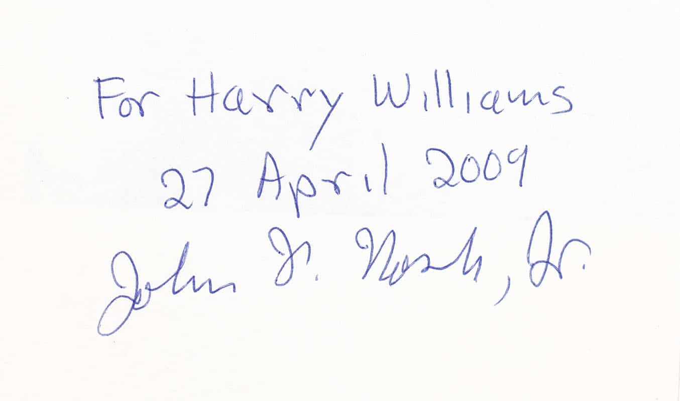 First edition of this volume which compiles John Nash's most well-known papers. Octavo, original black cloth, illustrated. Presentation copy, inscribed by Nash on the half-title page, "For Harry Williams 27 April 2009 John F. Nash, Jr." Fine in a fine dust jacket. Jacket design by Grady Klein.