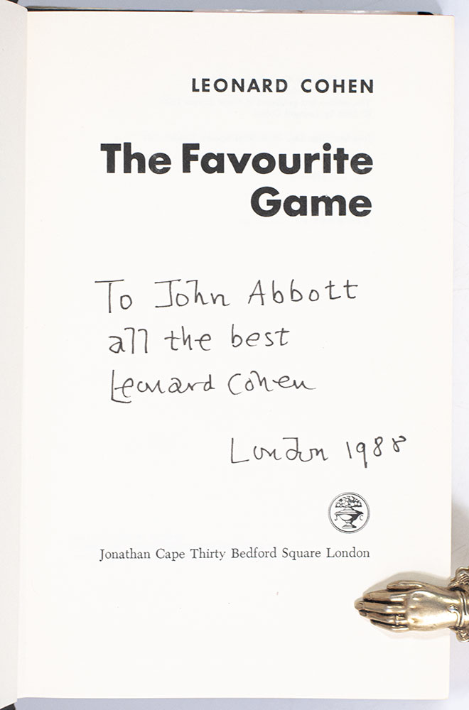 First printing of this edition of the author's classic work. Octavo, original cloth. Presentation copy, inscribed by the author on the title page, "To John Abbott all the best Leonard Cohen London 1988." Near fine in an near fine price-clipped dust jacket. Jacket design by Barry Hall.