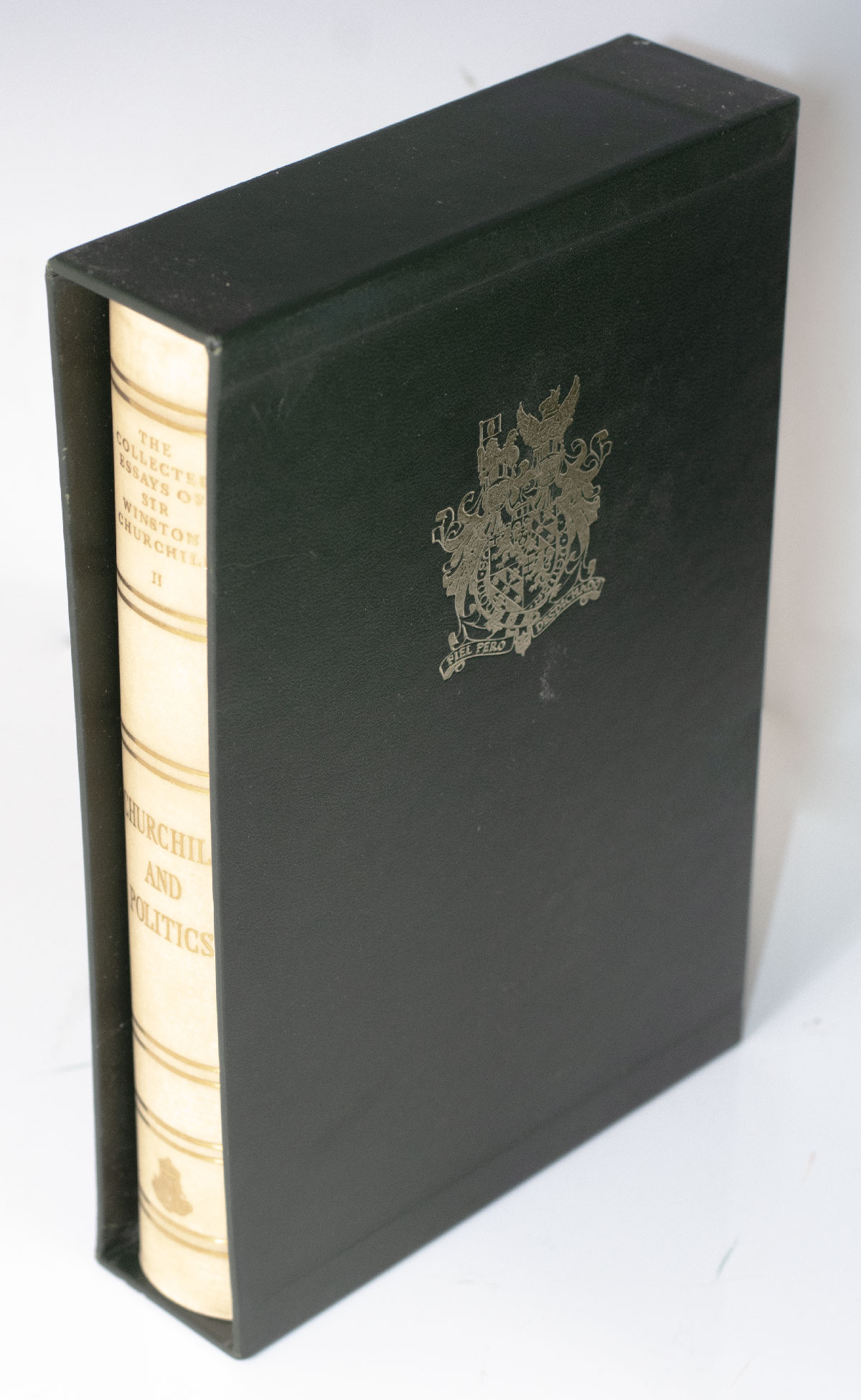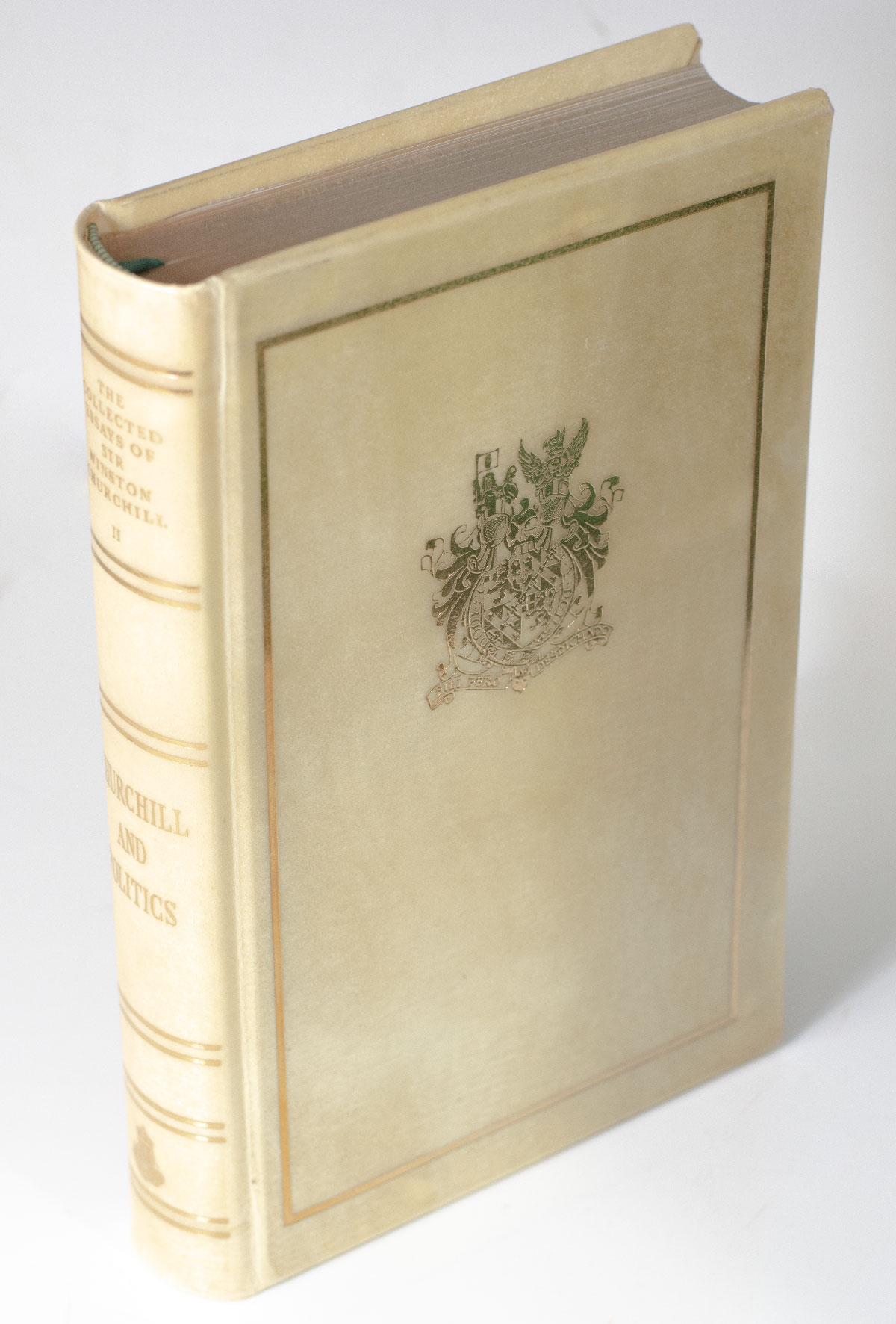 Centenary limited edition of Churchill’s complete Works, one of only 3000 sets produced, with the additional four volumes usually not present. Octavo, original full vellum, 38 volumes, stamped with the Churchill arms, all edges gilt, marbled endpapers, original dark green slipcases, also gilt-stamped with the Churchill coat of arms. In near fine to fine condition in the original slipcases. An exceptional set.