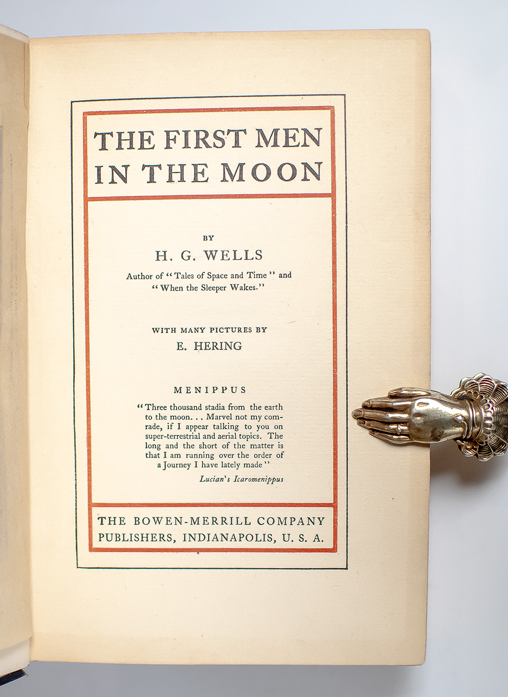 The First Men in the Moon tells the story of a journey to the Moon undertaken by the two protagonists: a businessman narrator, Mr. Bedford; and an eccentric scientist, Mr. Cavor. When the reach the moon, Bedford and Cavor discover that it is inhabited by a sophisticated extraterrestrial civilization of insect-like creatures they call "Selenites". The work was originally serialized in The Strand Magazine from December 1900 to August 1901 and published in book form in 1901. "The last and most complex [of Wells's early scientific romances] is The First Men in the Moon. The two first men, Bedford and Cavor are well-contrasted, the civilization of the Selenites is excellent both as horror and satire; and the novel abounds with wonderful passages of unforced description at which Wells is unrivaled. This lovely book also contains much of Wells's delightful humor; it has kept the joints of his discourse oiled to this day. After The First Men in the Moon, Wells's science fiction novels are never quite the same" (Bleiler , Science Fiction Writers). "One of Wells better known and altogether delightful scientific romances" and "an example of Wells humour and satire at its best" (Feir 18).