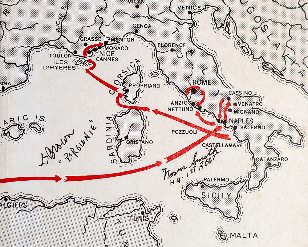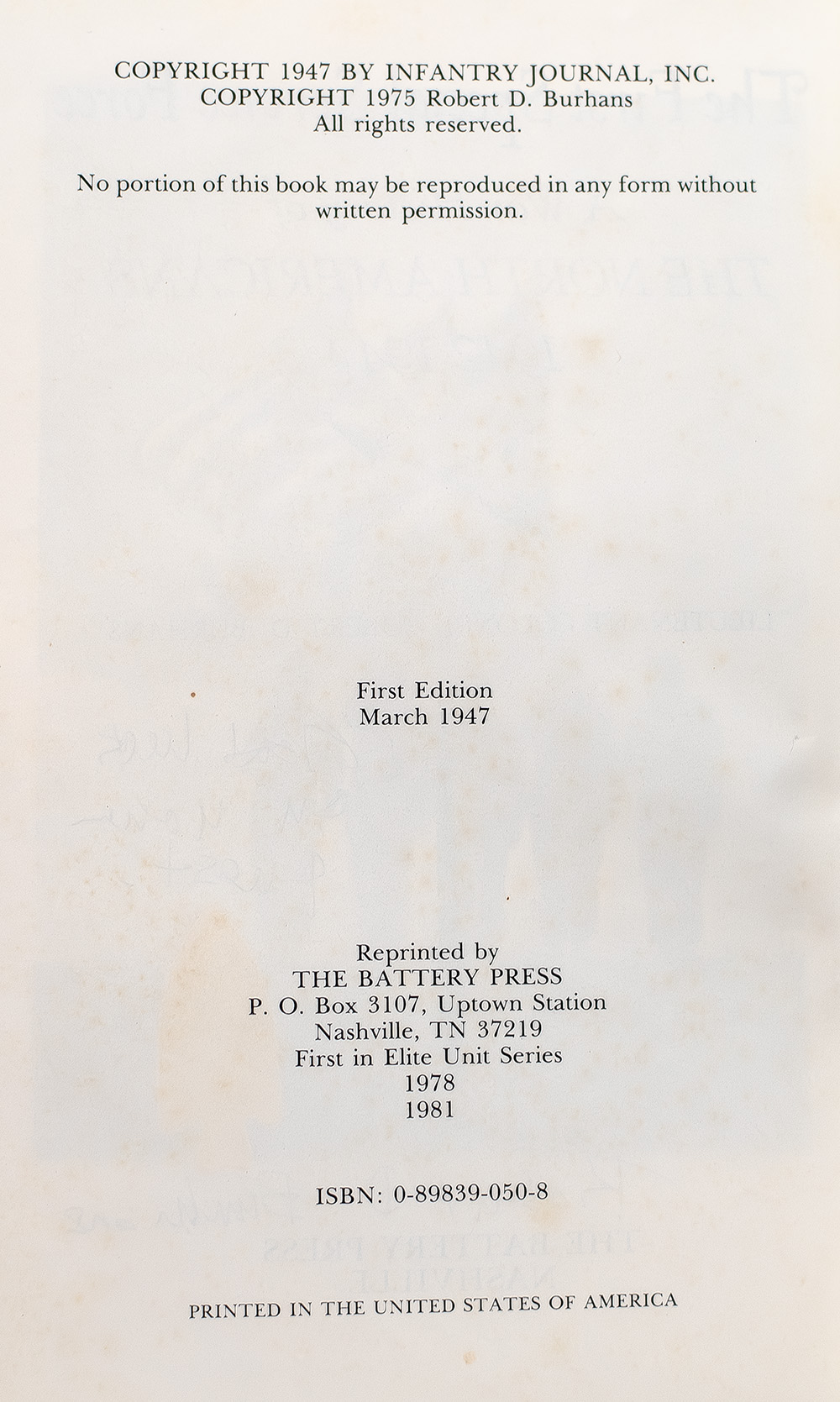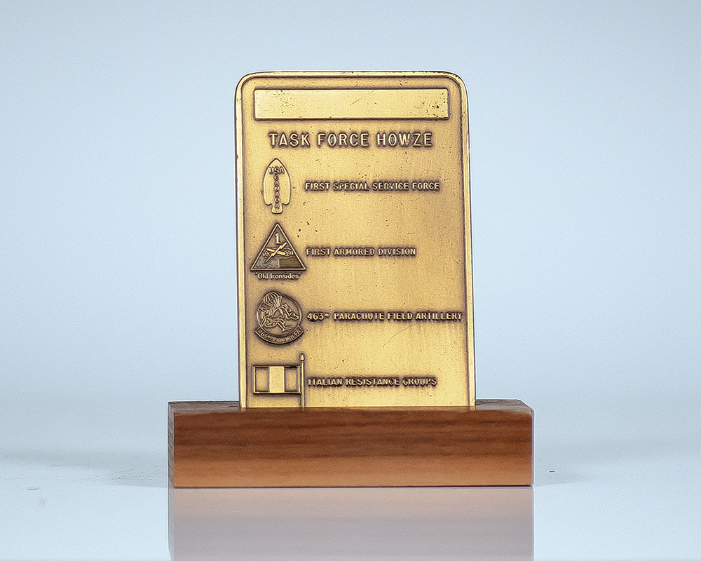 Later printing of the definitive account of the First Special Service Force. Octavo, original publisher's cloth, cartographic endpapers, illustrated. Signed by approximately 115 members of the First Special Service Force on the pastedown, verso of the front cartographic endpaper, half-title page, and rear cartographic endpapers. Additionally inscribed by the author on the title page, "Good luck on your quest Robert D. Burhans." Near fine in a very good dust jacket. Accompanied by a bronze commemorative medal issued by the First Special Service Force Association on June 4, 1984, in honor of Task Force Howze that aided the FSSF in the liberation of Rome, Italy, during World War II.
