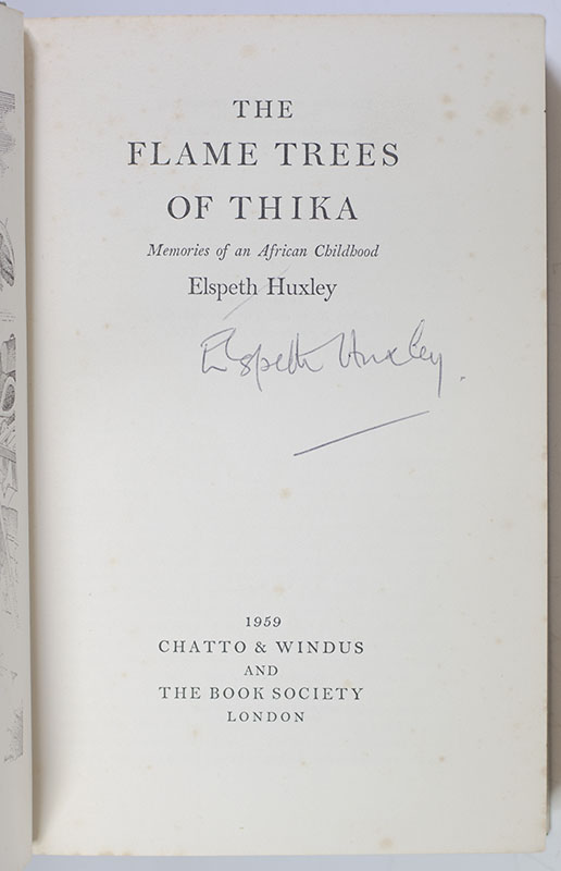 "How much does one imagine, how much observe? One can no more separate those functions than divide light from air, or wetness from water": First Edition of Elspeth Huxley's The Flame Trees of Thika; Signed by Her