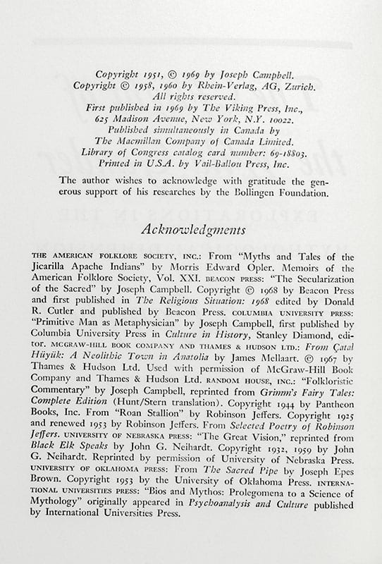 First edition of Campbell's first collection of essays. Octavo, original cloth. Association copy, inscribed by the author on the front free endpaper, "For Richard Adams on the occasion of our first meeting- with all good wishes Joseph Campbell 4/19/78." Best known as the author of Watership Down, English novelist Richard Adams was heavily influenced by American professor Joseph Campbell’s work in comparative mythology, specifically the concept of the monomyth, or journey of the archetypal hero that can be applied as a common template to a range of mythological narratives. Popularized in The Hero with a Thousand Faces, Campbell described the narrative pattern of the hero’s journey as follows: “A hero ventures forth from the world of common day into a region of supernatural wonder: fabulous forces are there encountered and a decisive victory is won: the hero comes back from this mysterious adventure with the power to bestow boons on his fellow man.” He and other scholars described the narratives of Odysseus, Gautama Buddha, Moses, and Jesus Christ in terms of the monomyth. Adams’ Watership Down exhibits strong parallels to the epic themes of Homer’s Odyssey, following a group of anthropomorphised rabbits who encounter perils and temptations on their journey to establish a new home after their warren is destroyed. Bookplate of Richard Adams, near fine in a near fine dust jacket. Jacket design by Jules Maidoff.