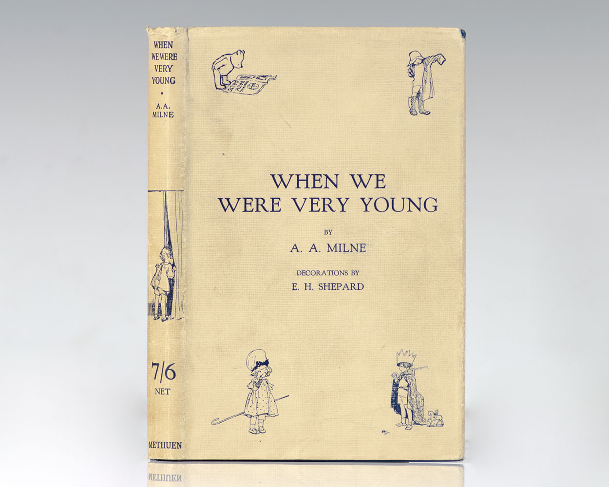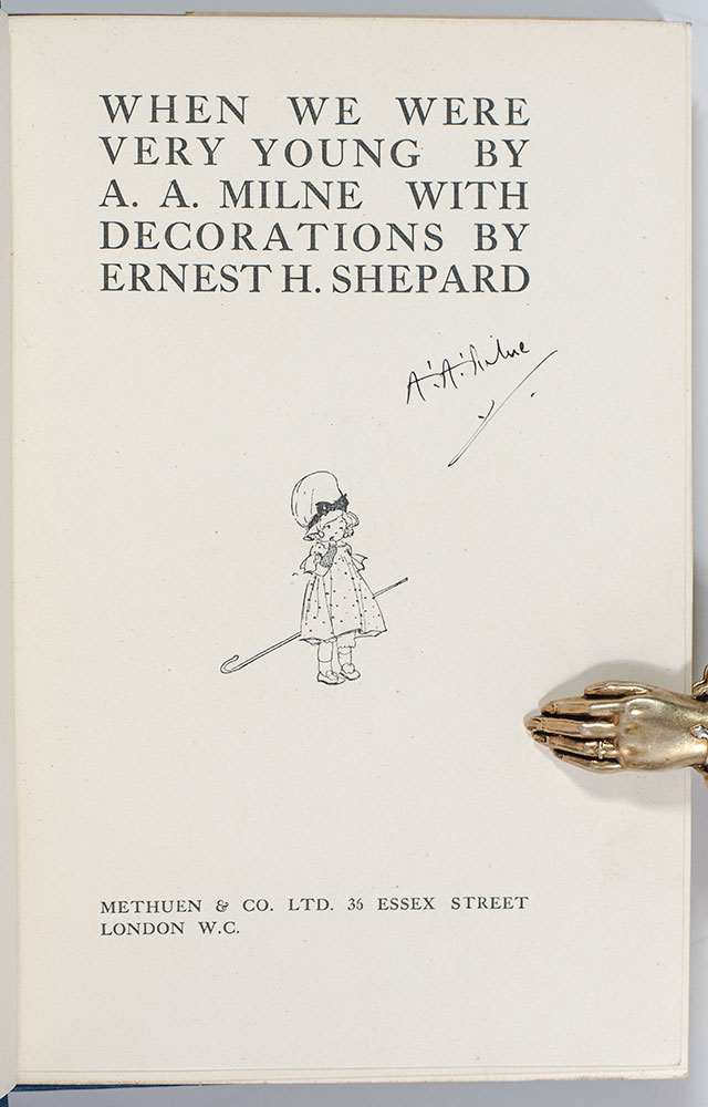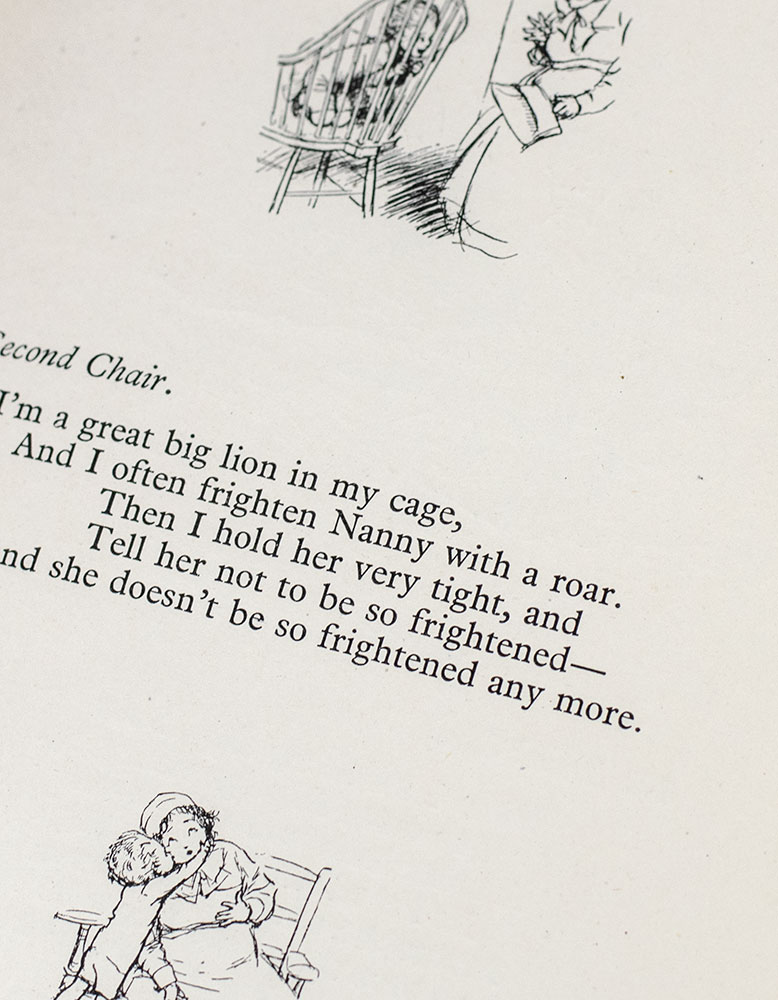 “Although Alan Alexander Milne wrote novels, short stories, poetry and many plays for adults, in addition to his work as assistant editor for Punch from 1906 to 1914, it is his writings for children that have captured the hearts of millions of people worldwide and granted Milne everlasting fame” (Silvey, 461). Milne wrote most of these poems at the request of friend and fellow poet Rose Fyleman, who was planning a new children’s magazine. “On a rain-blighted holiday in Wales, [Milne] escaped from the crowd of fellow guests to the summerhouse, and for 11 days wrote a set of children’s verses, one each day… ‘There on the other side of the lawn was a child with whom I had lived for three years [his son, Christopher Robin]… and here within me were unforgettable memories of my own childhood.’ He added more verses when he got home, enough for a book, and allowed some to be published in advance in Punch” (Carpenter & Prichard, 351). Shepard, a Punch staff artist at the time, provided delightful line vignettes, resulting in “a wonderful marriage of verse and vision. His delicately precise and fresh drawings had an instant appeal” (DNB).