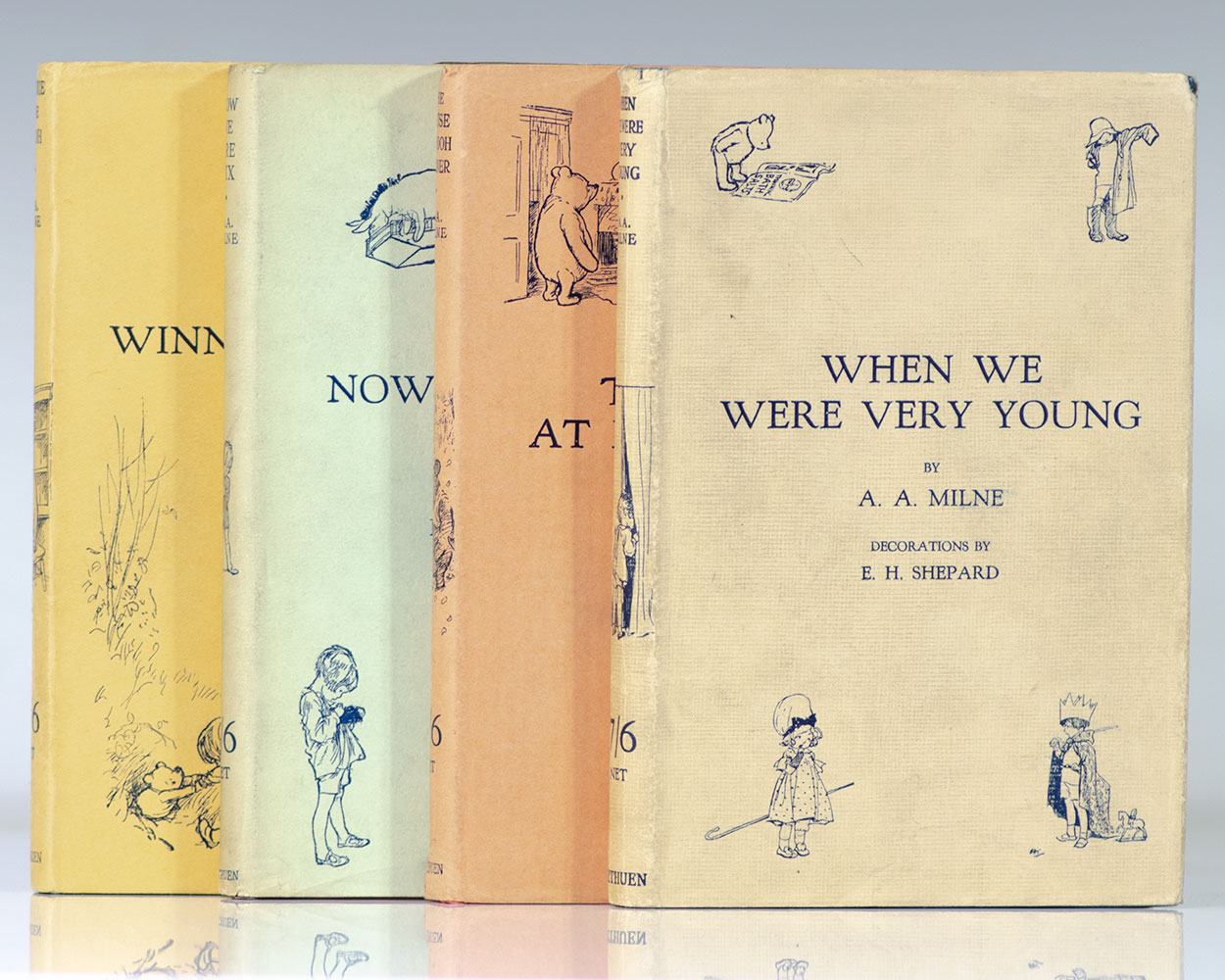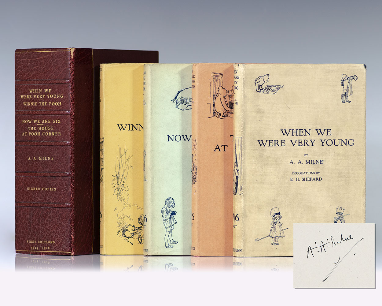 Complete first edition set of Milne’s wonderful Pooh quartet. Octavo, original cloth lettered and embellished in gilt, pictorial endpapers, top edges gilt, illustrated by Ernest Shepard. Each of the four volumes is signed by A.A. Milne on the title page. Each volume is fine in a near fine dust jacket. Housed in a custom half morocco clamshell box. Exceptionally rare and desirable in this condition and with all four volumes signed by Milne.