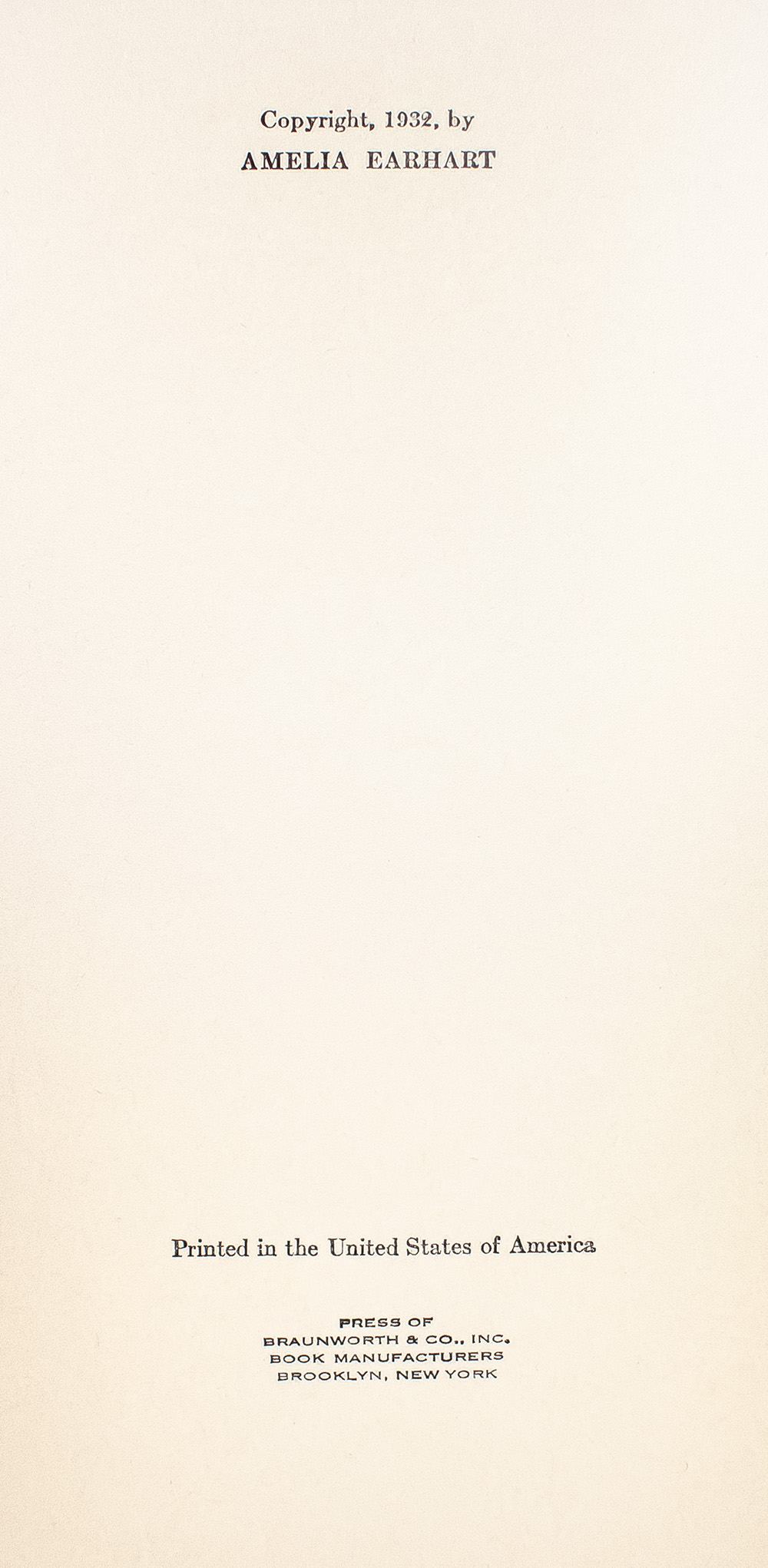 First edition of Earhart's account of her childhood, her fascination with aviation, and her life through her 1932 flight across the Atlantic. Octavo, original cloth, illustrated throughout, with the original record in the rear pastedown. Boldly signed by Amelia Earhart on the front free endpaper. In very good condition.