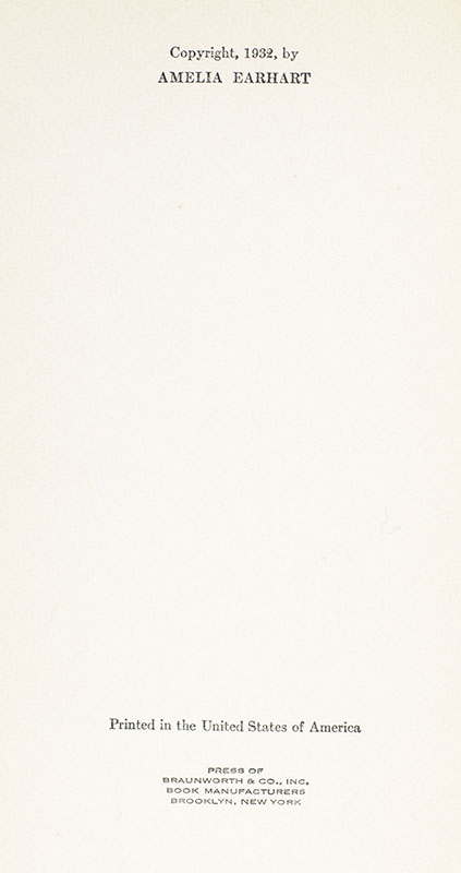 First edition of Earhart's account of her childhood, her fascination with aviation, and her life through her 1932 flight across the Atlantic. Octavo, original cloth, illustrated throughout, with the original record in the rear pastedown. Signed by Amelia Earhart on the front free endpaper. Fine in a very good dust jacket. Housed in a custom half morocco clamshell box. A nice example, rare and desirable signed and in the original dust jacket.