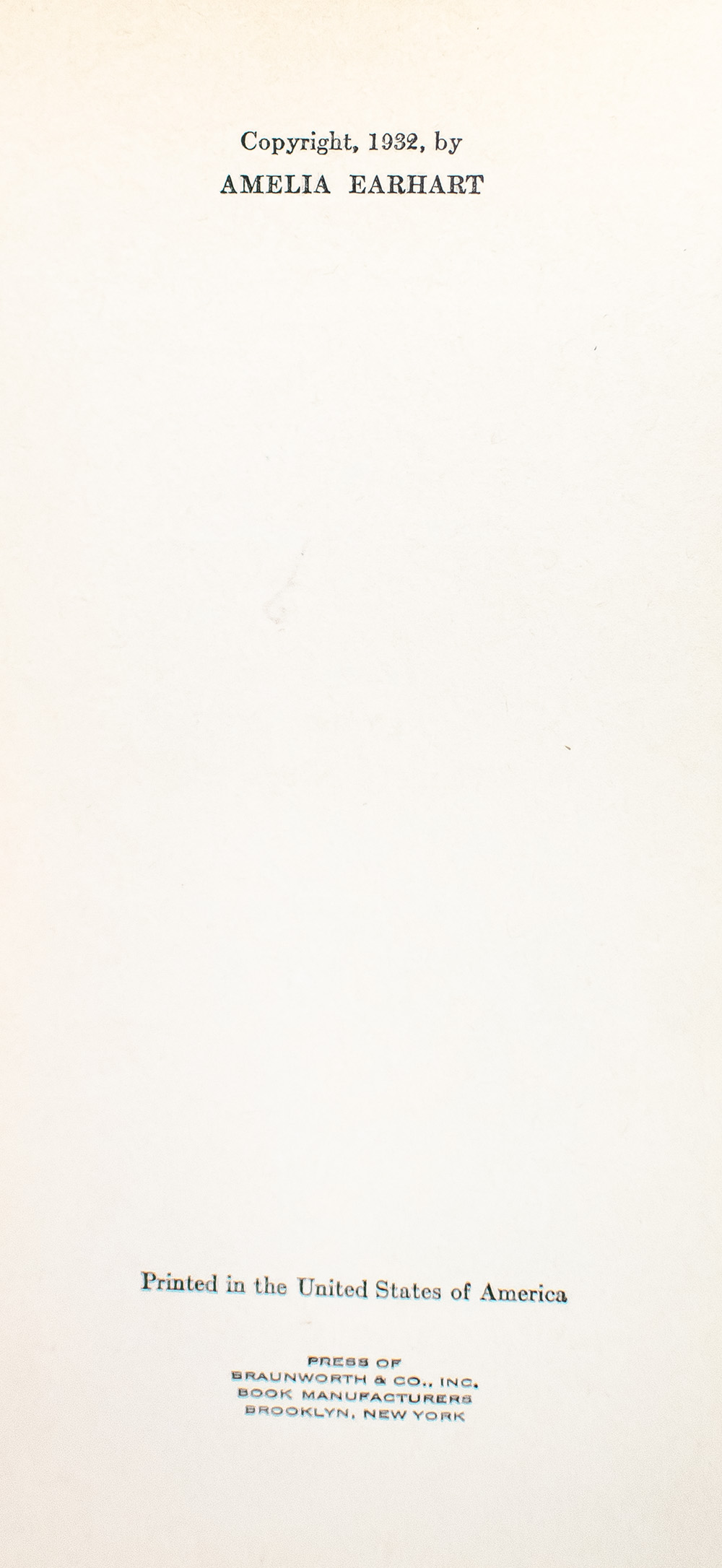 First edition of Earhart's account of her childhood, her fascination with aviation, and her life through her 1932 flight across the Atlantic. Octavo, original cloth, illustrated throughout, with the original record in the rear pastedown. Boldly signed by Amelia Earhart on the front free endpaper. In very good condition.