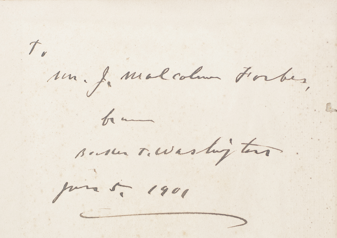 Early printing of Booker T. Washington's first major work. Octavo, original cloth, frontispiece. Presentation copy, inscribed by the author on the front pastedown, "To Mr. J. Malcolm Forbes from Booker T. Washington Jan 5, 1901." The recipient, J. Malcolm Forbes was an American businessman and sportsman. He was a prominent yachtsman and breeder of Standardbred horses. Forbes has been described as one of the most important harness racing breeders of all time. In 1890 he purchased Jack, 2:12, for a speedway horse. As his interest grew he established Forbes Farm by buying and consolidating the Hunt, Davenport and Farrington farms. In very good condition.