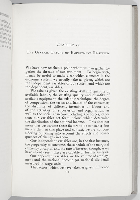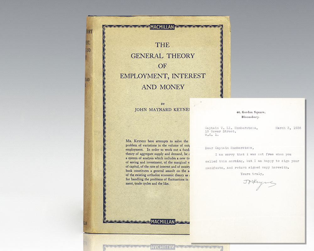 First Edition of "The most influential social science treatise of the twentieth century": First Edition of Keynes' The General Theory; In the Rare Original Dust Jacket; with an autographed letter from Keynes to Captain Thomas Lloyd Humberstone