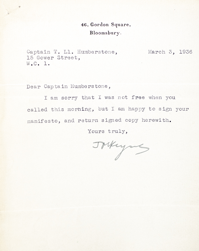 First edition of the economist's masterpiece, with a rare autographed letter by Keynes laid in. Octavo, original cloth. The signed letter from Keynes, with his 46 Gordon Square Bloomsbury letterhead, was sent the month following the publication of the General Theory. Keynes write to the recipient, "Dear Captain Humberstone, I am sorry that I was not free when you called this morning, but I am happy to sign your manifesto, and return signed copy herewith. Yours truly, J. M. Keynes." The recipient, Thomas Lloyd Humberstone was an academic at the University of London, who campaigned on the subject of education and related Liberal political issues; he published University Reform in London in 1926, with a preface by H. G. Wells. Near fine in a very good dust jacket. Rare and desirable in this condition and with the signed letter.