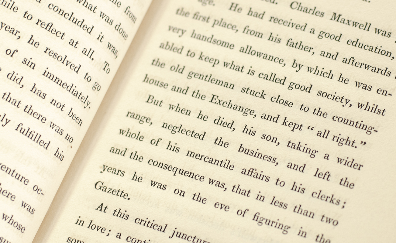 First edition of Dalton's The Gentleman in Black. Octavo, bound in three quarter navy morocco with gilt titles and tooling to the spine in six compartments within raised gilt bands, marbled endpapers, top edge gilt, illustrated with an engraved frontispiece and four engraved plates by George Cruikshank. In near fine condition. A handsome example.