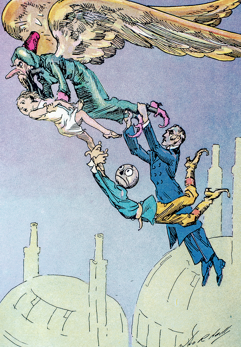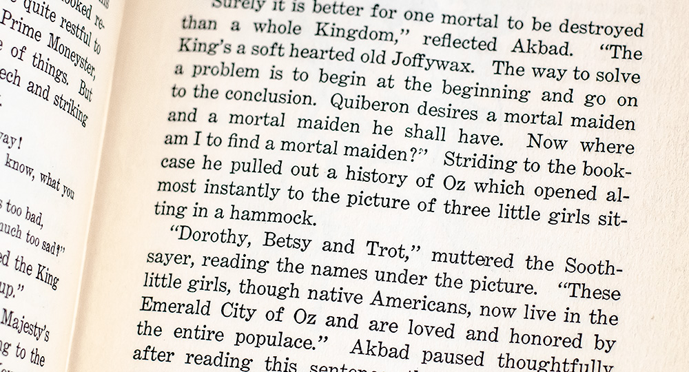 First edition, first printing of Thompson's eighth fantastical continuation of Frank Baum's Oz stories. Octavo, original red cloth with color pictorial paper onlay, illustrations by John R. Neill. In good condition. Slight rubbing to the extremities. Watercolor to the illustration on the front pastedown by a previous owner. Ownership signature in black crayon to the ownership page. First issue with the perfect, undamaged 'r' on page 116 and all color plates present and accounted for.