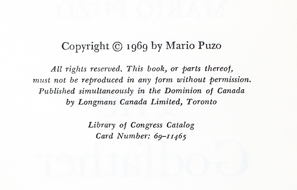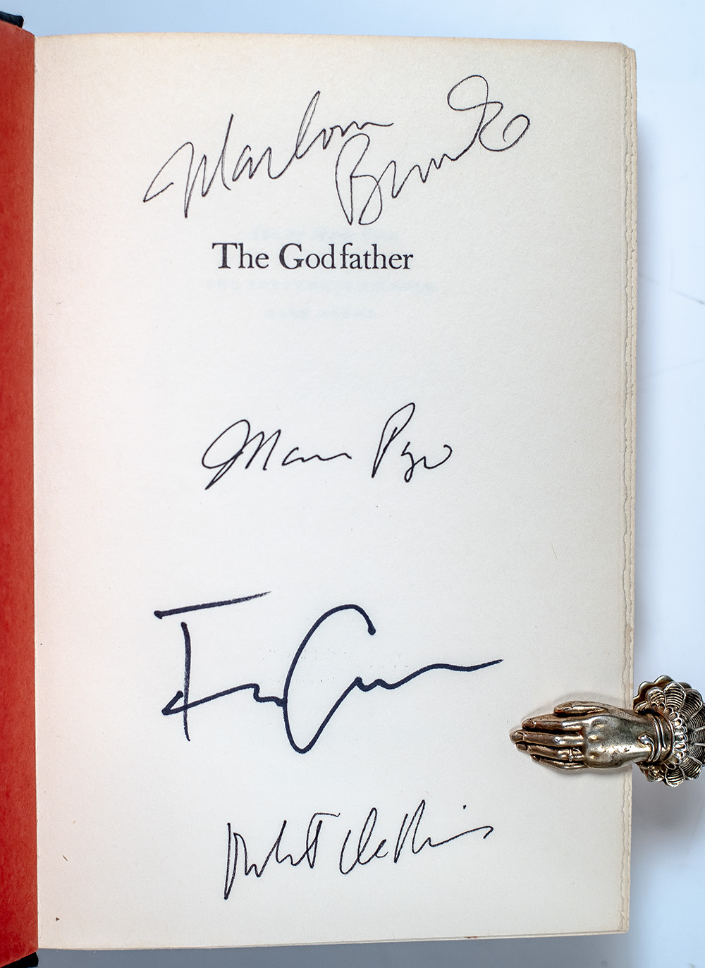 First edition of Puzo's definitive novel of the Mafia underworld, signed by him and legendary Academy Award-winning actor Marlon Brando, director Francis Ford Coppola and Robert De Niro. Octavo, original half black cloth. Boldly signed by both Mario Puzo and Marlon Brando on the front free endpaper. Fine in a near fine dust jacket. Jacket art by S. Neil Fujita. Housed in a custom full morocco clamshell box made by the Harcourt Bindery. Rare and desirable.