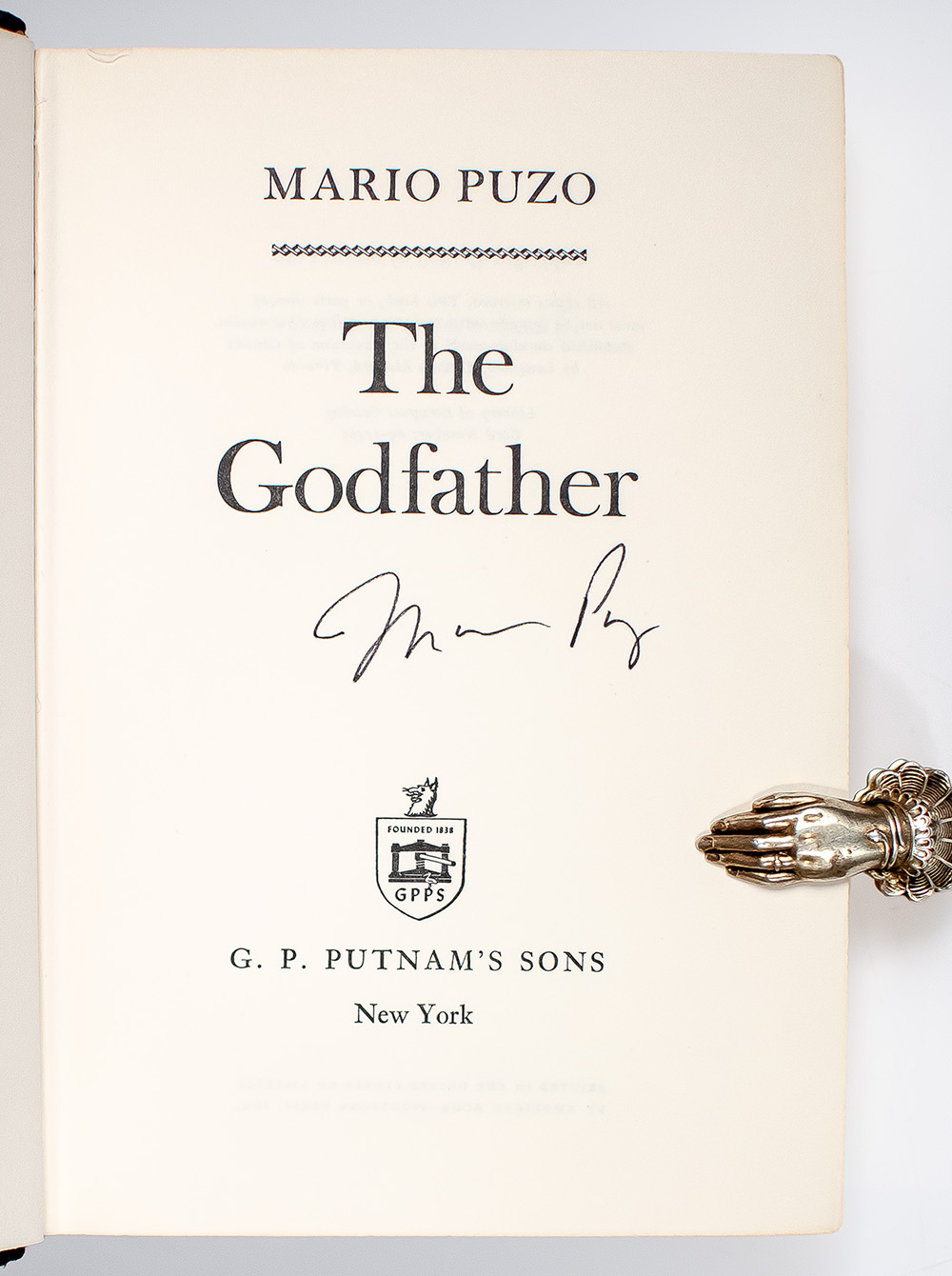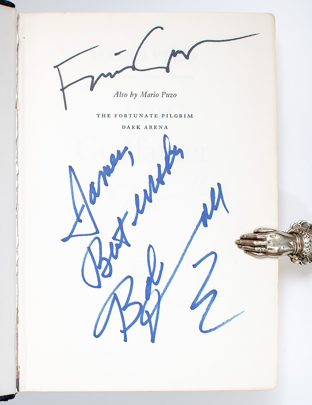First edition of Puzo's definitive novel of the Mafia underworld, signed by Mario Puzo, director Francis Ford Coppola and actor Robert Duvall. Octavo, original half black cloth. Boldly signed by Mario Puzo on the title page, signed by Francis Ford Coppola and inscribed by Academy Award-winning actor Duvall, "James Best Wishes Bob Duvall" on the half-title page. Near fine in a near fine dust jacket, ownership stamp to the front free endpaper. Jacket art by S. Neil Fujita. Rare and desirable.