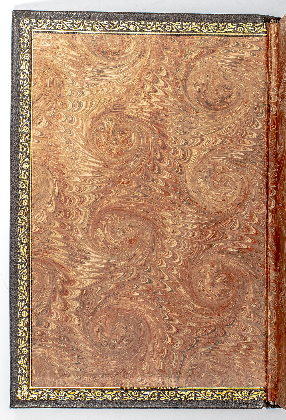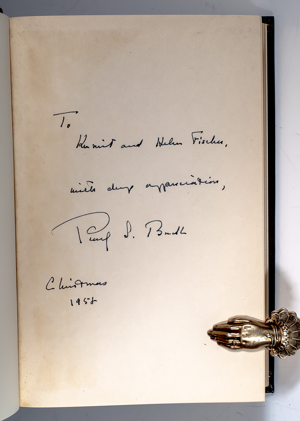 First edition of the author's Pulitzer Prize-winning novel and masterpiece. First issue with "flees" for "fleas" on page 100, line 17. Octavo, bound in full morocco by the Harcourt Bindery, gilt titles and tooling to the spine in six compartments within raised gilt bands, gilt ruling to the front and rear panels, gilt inner dentelles stamp-signed by the Harcourt Bindery, marbled endpapers, all edges gilt. Presentation copy, inscribed by the author on a page bound in, "To Kermit and Helen Fischer with deep appreciation, Pearl S. Buck Christmas 1958." In fine condition.