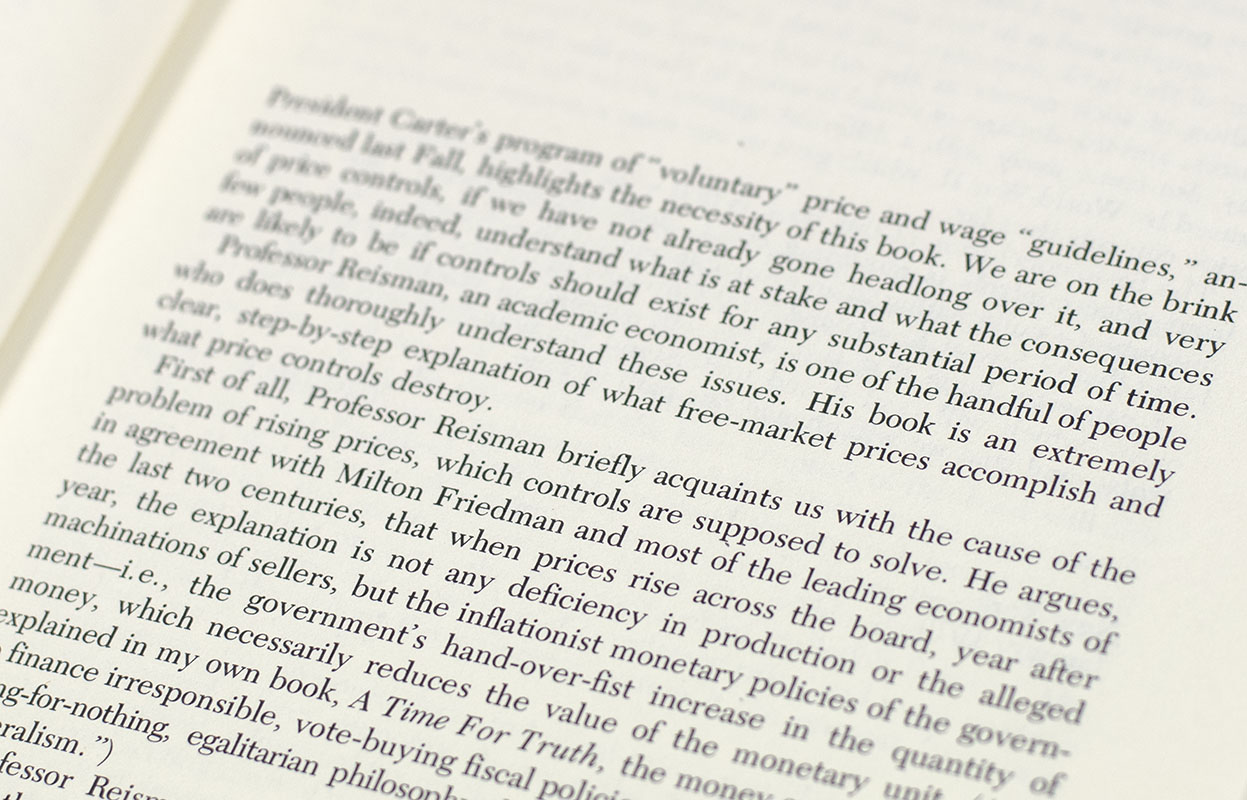 Simon states in his foreword to the present volume, "President Carter's program of 'voluntary' price and wage 'guidelines,' announced last Fall, highlights the necessity of this book. We are on the brink of price controls, if we have not already gone headlong over it, and very few people, indeed, understand what is at stake and what the consequences are likely to be if controls should exist for any substantial period of time. Professor Reisman, an academic economist, is one of the handful of people who does thoroughly understand these issues."