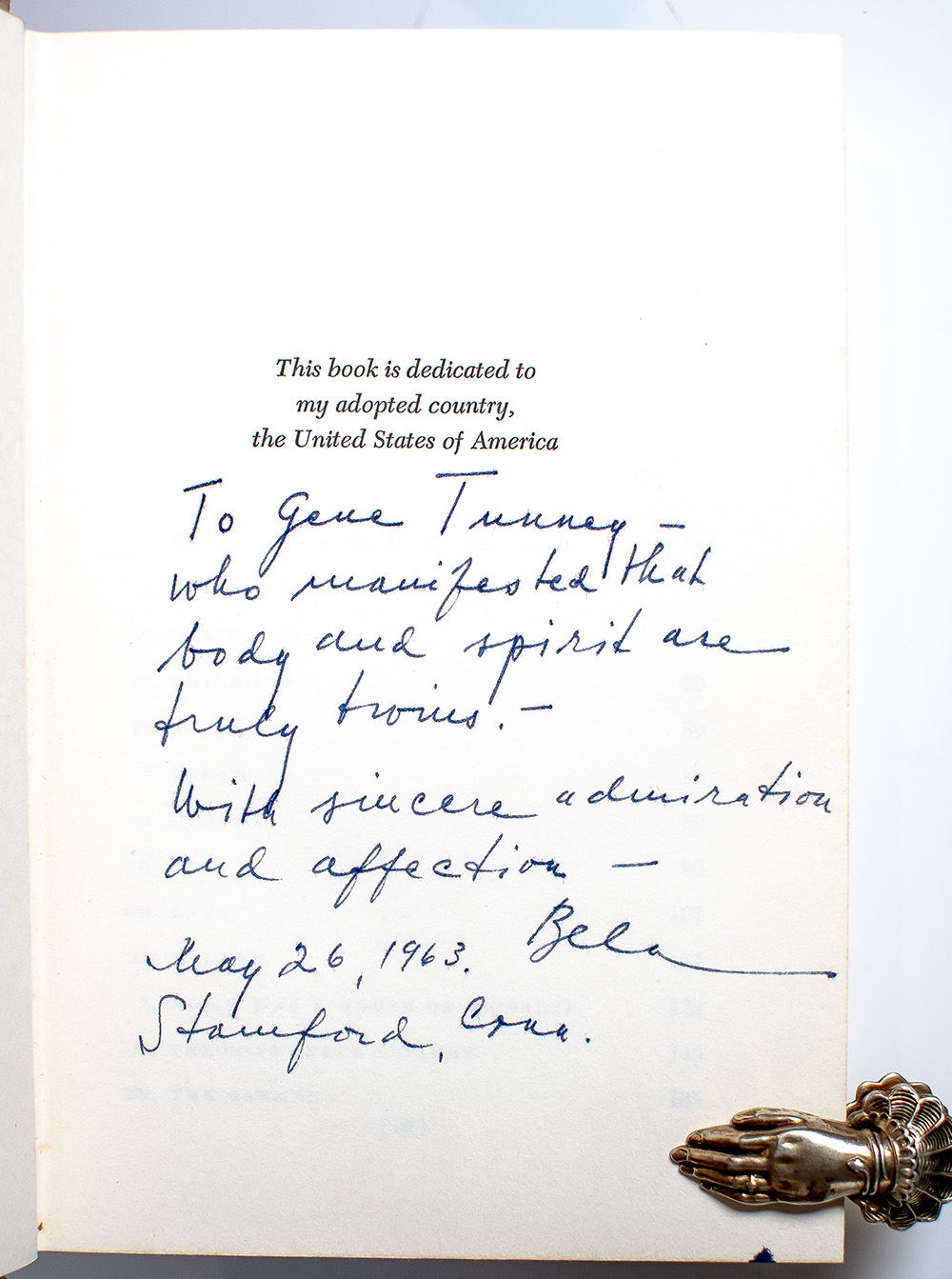 First edition of this famed journalist's work on the Eisenhower brothers. Octavo, original cloth. Association copy, inscribed by the author to the great boxing champion on the dedication page, "To Gene Tunney, who manifested that body and spirit are truly ---- [?]. With sincere admiration and affection, Bela, May 26, 1963, Stamford, Conn." Bela Kornitzer, a Hungarian-born journalist, made a career of interviewing prominent men. In 1940 he compiled his many interviews into a two-volume book, Fathers & Sons, which earned him a place on the Gestapo's most-wanted list. During the Nazi occupation, he sought protection for himself and for one hundred families under Cardinal Angelo Rotta, Papal Nuncio of Hungary, and is credited with saving the lives of these families. He fled the Communists in Hungary and came to America in 1947, and proceeded to document the lives of many prominent American men. Near fine in a very good dust jacket, remnant of paper to the front free endpaper. Jacket design by Rupert Finegold. Books signed and inscribed by Bela Kornitzer are rare.