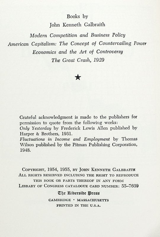 First edition, second printing, without the date on the title page. Octavo, original red cloth. Boldly signed by John Kenneth Galbraith on the front free endpaper. Near fine in a good dust jacket with some wear and tear. Jacket design by Lucy E. Clark.
