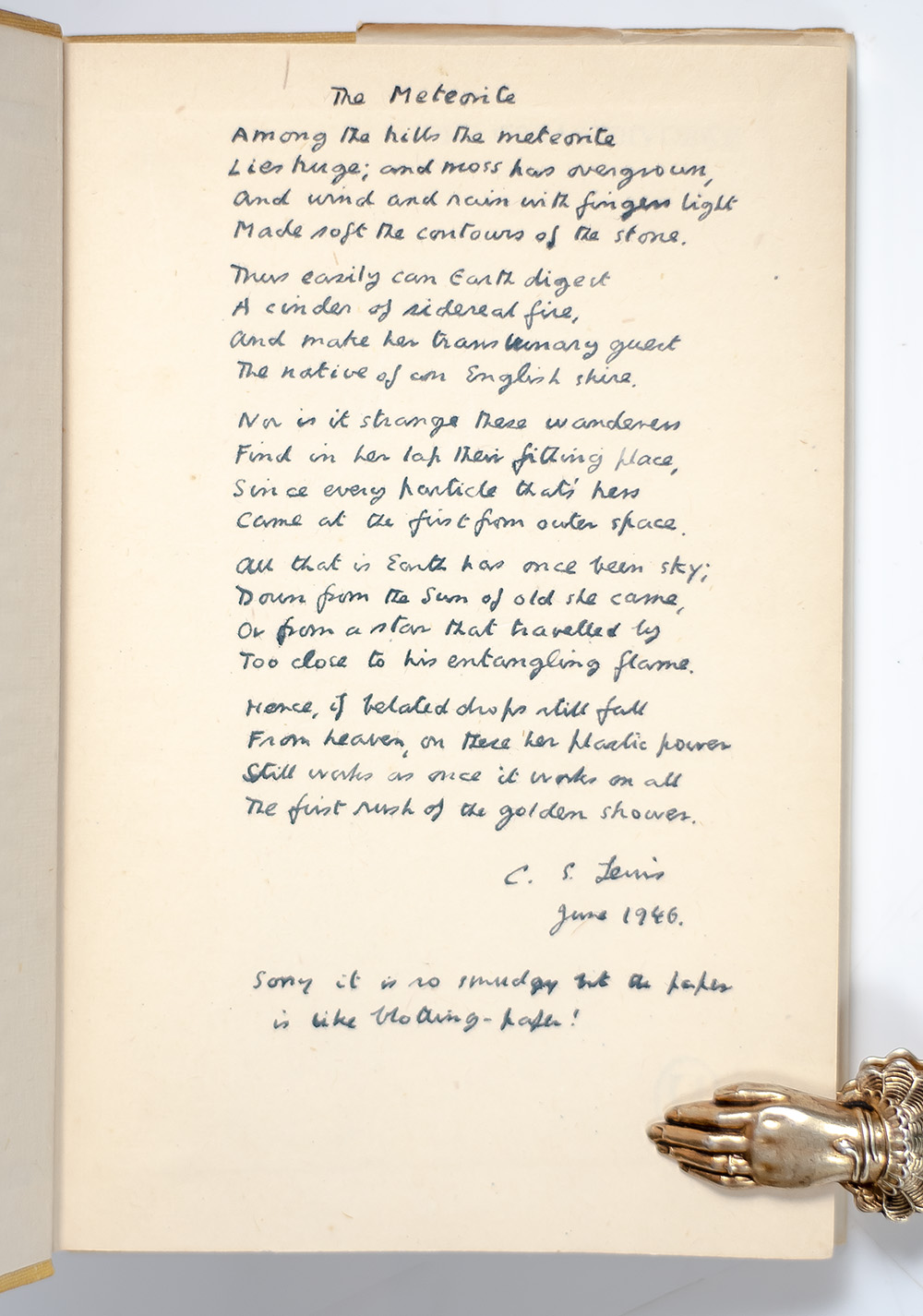 "Thus easily can Earth digest A cinder of sidereal fire, And make her translunary guest The native of the English shire": First edition, presentation copy of The Great Divorce; inscribed by C.S. Lewis with a pre-publication appearance of 'The Meteorite'