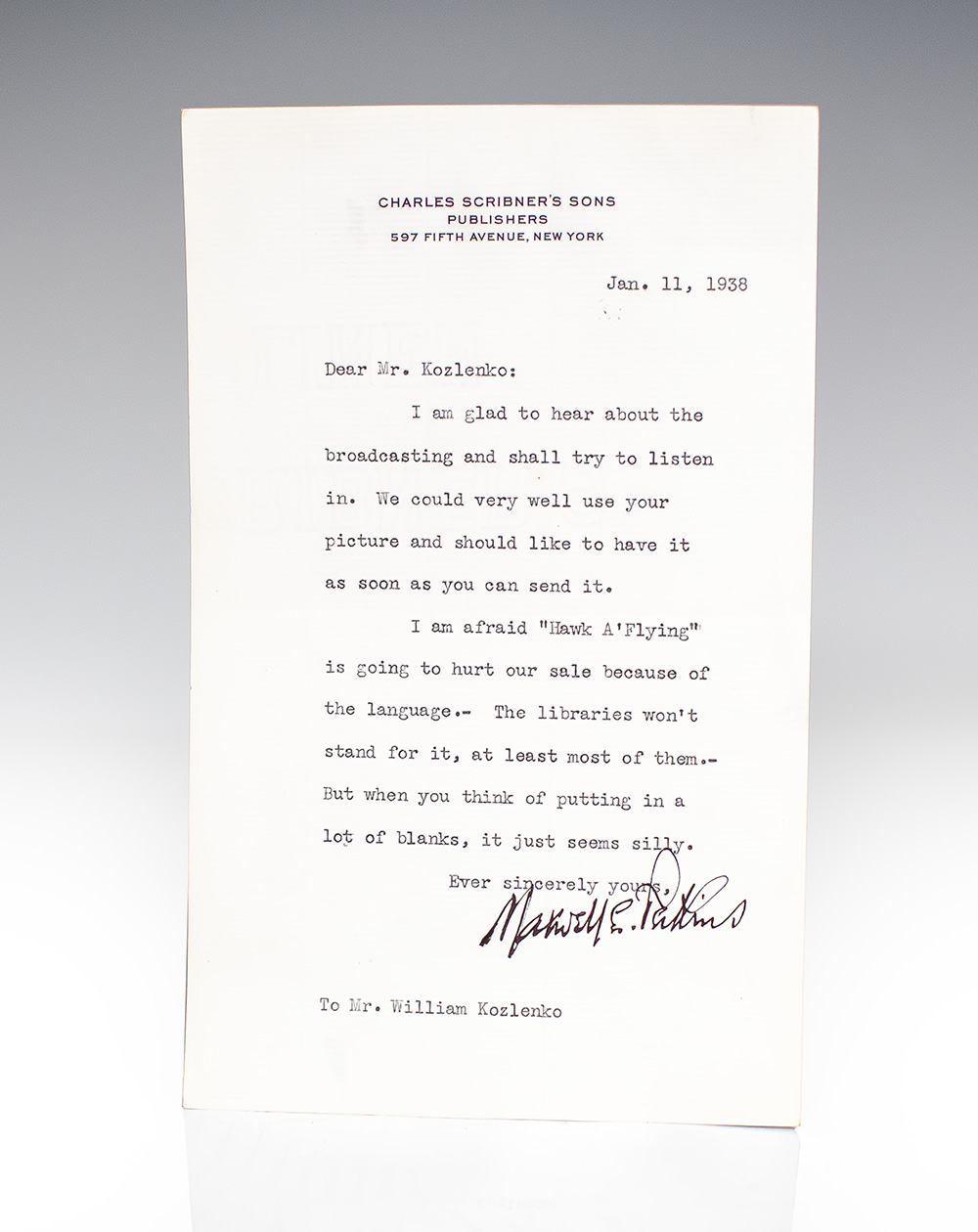 First edition, first state of Fitzgerald's "most perfectly realized work of art" with "chatter" p.60, "northern" p.119, "sick in tired" p.205, and "Union Street station" p.211. Octavo, original dark green cloth with gilt titles to the spine. Accompanied by a typed letter signed by American editor Maxwell Perkins on Charles Scribner’s Sons letterhead. Best remembered for discovering F. Scott Fitzgerald, Ernest Hemingway, Thomas Wolfe, Marjorie Kinnan Rawlings, and James Jones, Maxwell Perkins made his first big find in 1919 when he signed F. Scott Fitzgerald. He was, at first, the only editor at Scribners that saw potential in The Romantic Egotist, the working title of Fitzgerald’s first novel, and it was rejected. Even so, Perkins worked with Fitzgerald to revise the manuscript until it was accepted by the publishing house. Its publication as This Side of Paradise (1920) marked the arrival of a new literary generation that would always be associated with Perkins. Maxwell Perkins, considered by many the greatest book editor of all time, left a monumental legacy in his thirty-seven years at the publishing house of Charles Scribner's Sons, helping shape literature. After working as a reporter for The New York Times, Perkins joined Scribner's Sons in 1910 as an advertising manager, before becoming an editor. At that time, Scribner's was known for publishing older authors such as John Galsworthy, Henry James, and Edith Wharton. Perkins, however, wished to publish younger writers. Unlike most editors, he actively sought out promising new authors; he made his first big find in 1919 when he signed F. Scott Fitzgerald. Initially, no one at Scribner's except Perkins had liked The Romantic Egotist, the working title of Fitzgerald's first novel, and it was rejected. Even so, Perkins worked with Fitzgerald to revise the manuscript until it was accepted by the publishing house. Its publication as This Side of Paradise (1920) marked the arrival of a new literary generation that would always be associated with Perkins. Fitzgerald's profligacy and alcoholism strained his relationship with Perkins. Nonetheless, Perkins remained Fitzgerald's friend to the end of Fitzgerald's short life, in addition to his editorial relationship with the author, particularly evidenced in The Great Gatsby (1925), which benefited substantially from Perkins' criticism. It was also through Fitzgerald that Perkins met Ernest Hemingway, publishing his first major novel, The Sun Also Rises, in 1926. In near fine condition. Housed in a custom half morocco clamshell box. A very nice example.